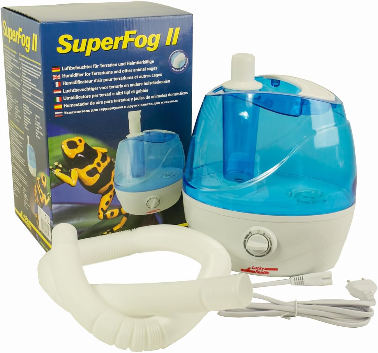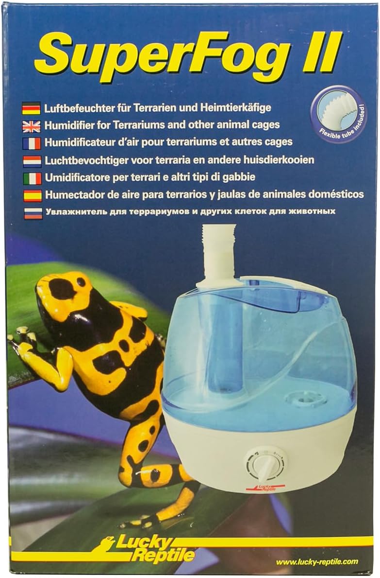 CLIMAT IDEAL - Aparatul nostru Lucky Reptile Super Fog II impresionează prin tehnologia de primă clasă și performanța ridicată și asigură un climat perfect și niveluri optime de umiditate în terariu! PUTERNIC - Umidificatorul are un rezervor de 2,1 litri și oferă o capacitate de aburire de până la 300 ml de apă pe oră, care poate fi reglată în funcție de dimensiunea terariului - nivelul de zgomot este de 30 dB. COMPACT ȘI FLEXIBIL - Sistemul măsoară 22x17x28 cm și poate fi ușor integrat în dulapul terariului - Furtunul lung și flexibil facilitează alimentarea cu umiditate în terariu. ACCESORII PRACTICE - Pentru terarii mici, vă recomandăm Super Fog Nano II, care poate fi ușor controlat datorită temporizatorului și higrostatului practic. PROMISIUNEA CALITĂȚII - Toate produsele noastre au fost dezvoltate în Germania timp de peste 20 de ani, cu multă pasiune și experiență, în conformitate cu cele mai înalte standarde de calitate - pentru că bunăstarea animalelor este importantă pentru noi! Alte detalii despre produs