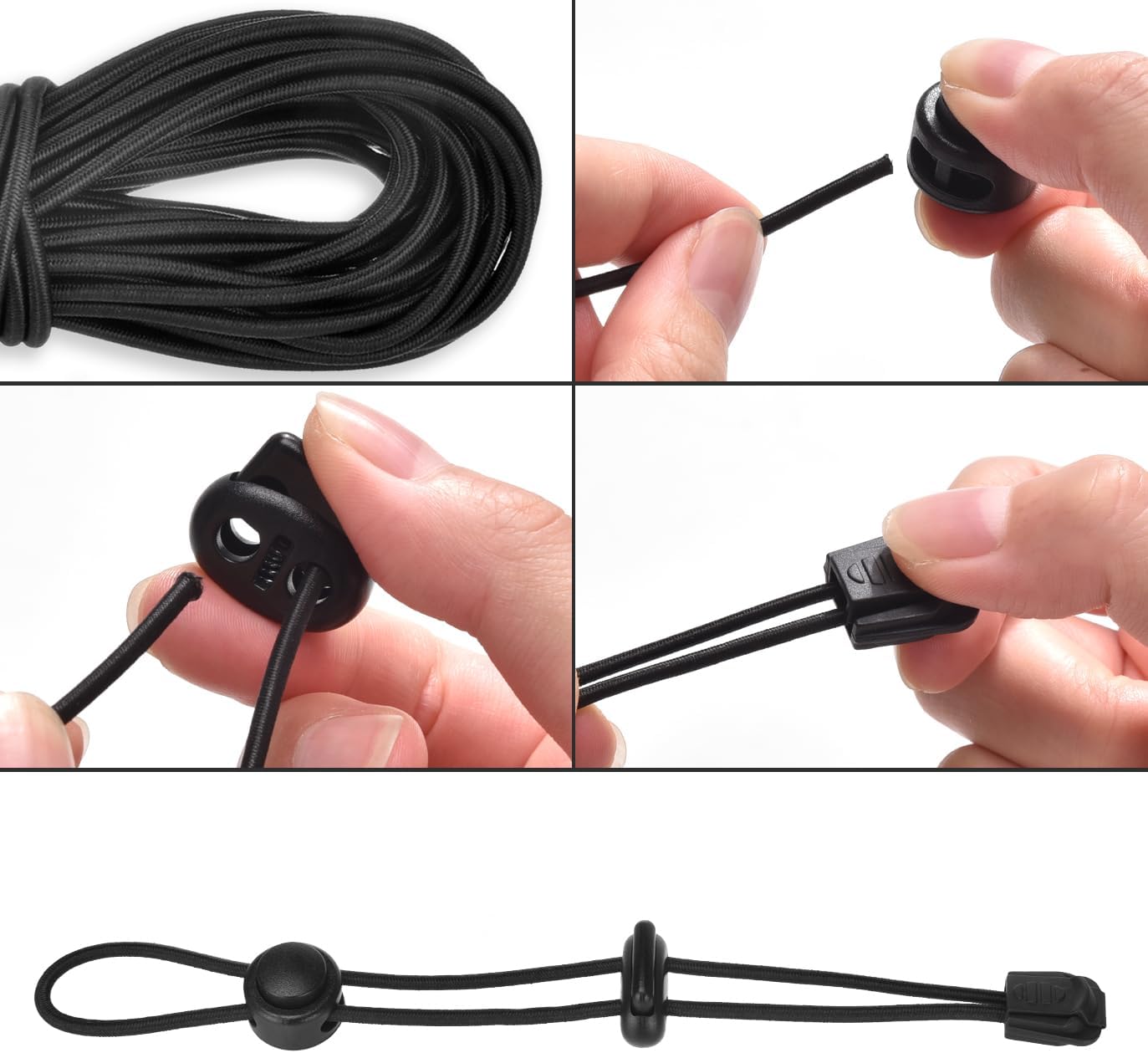 Set complet: 1 rolă de cordon elastic, 24 elemente de fixare a cordonului, 30 cleme de frânghie