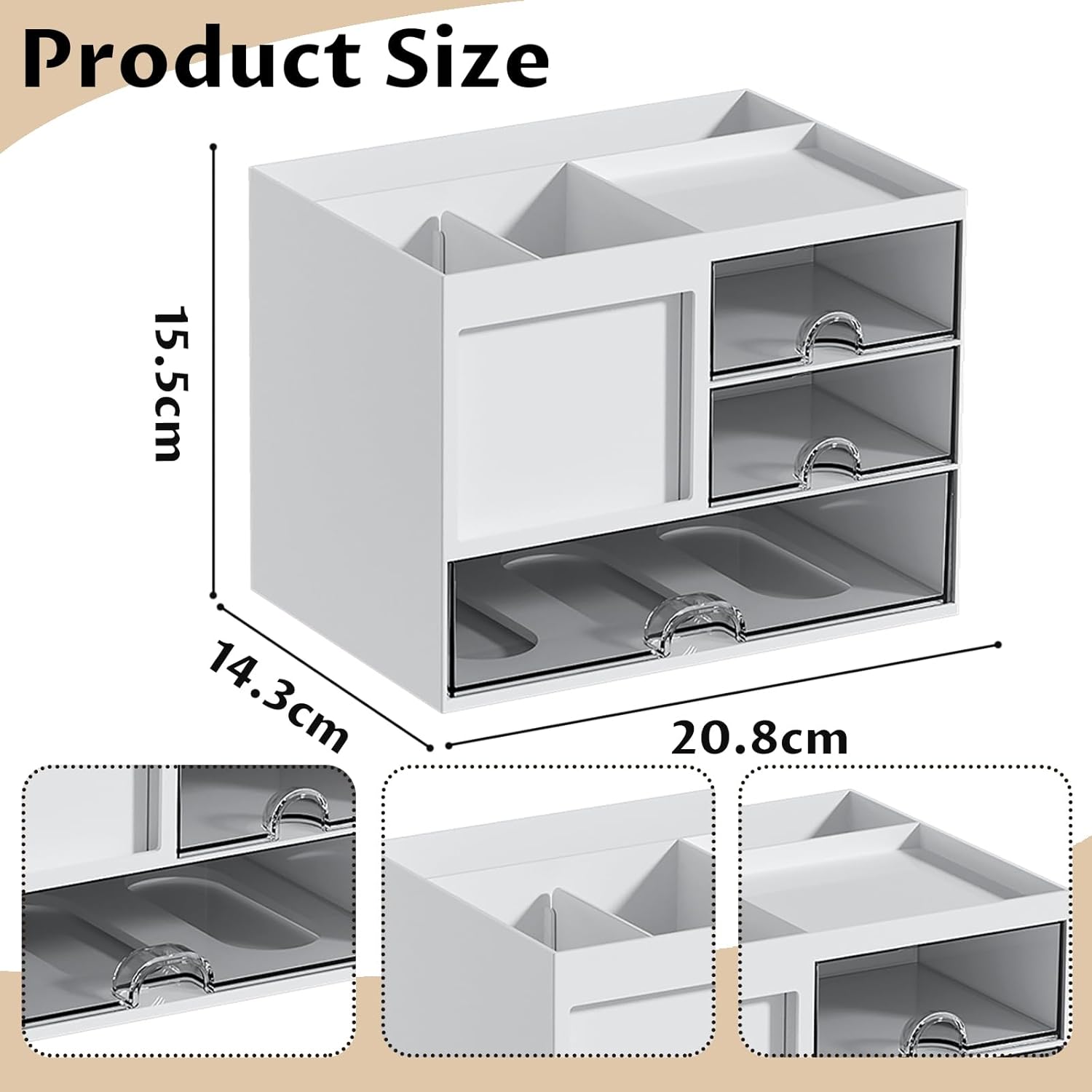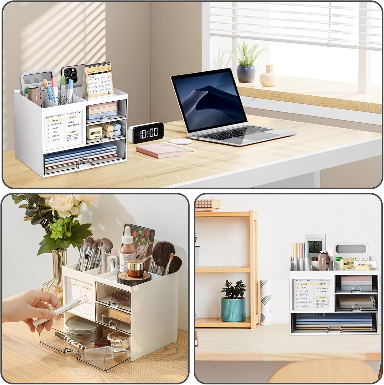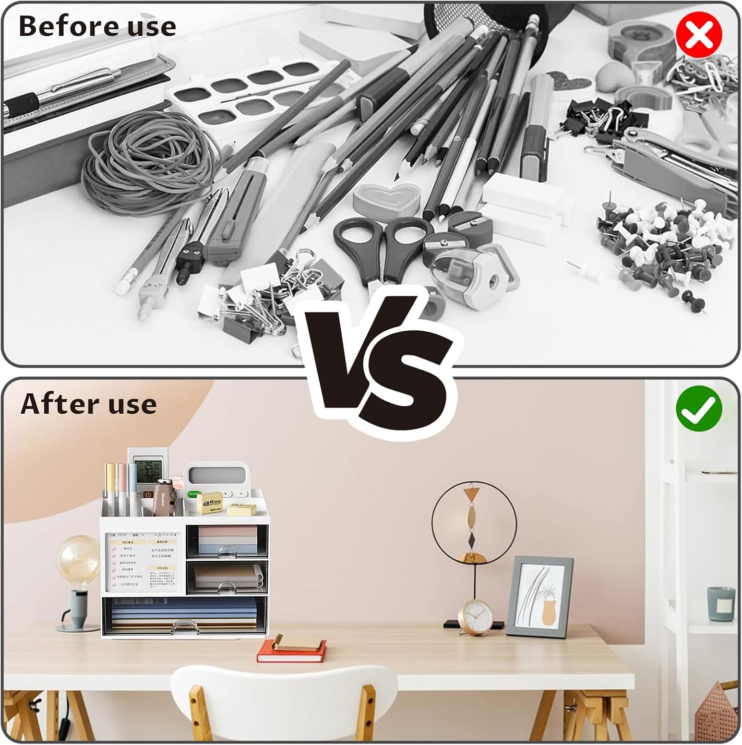 Design practic: Organizatorul de birou este echipat cu 4 compartimente și 3 sertare transparente, care pot sorta și stoca majoritatea articolelor de birou, vă mențin biroul curat și ordonat și economisiți timp pentru căutarea articolelor de care aveți nevoie.