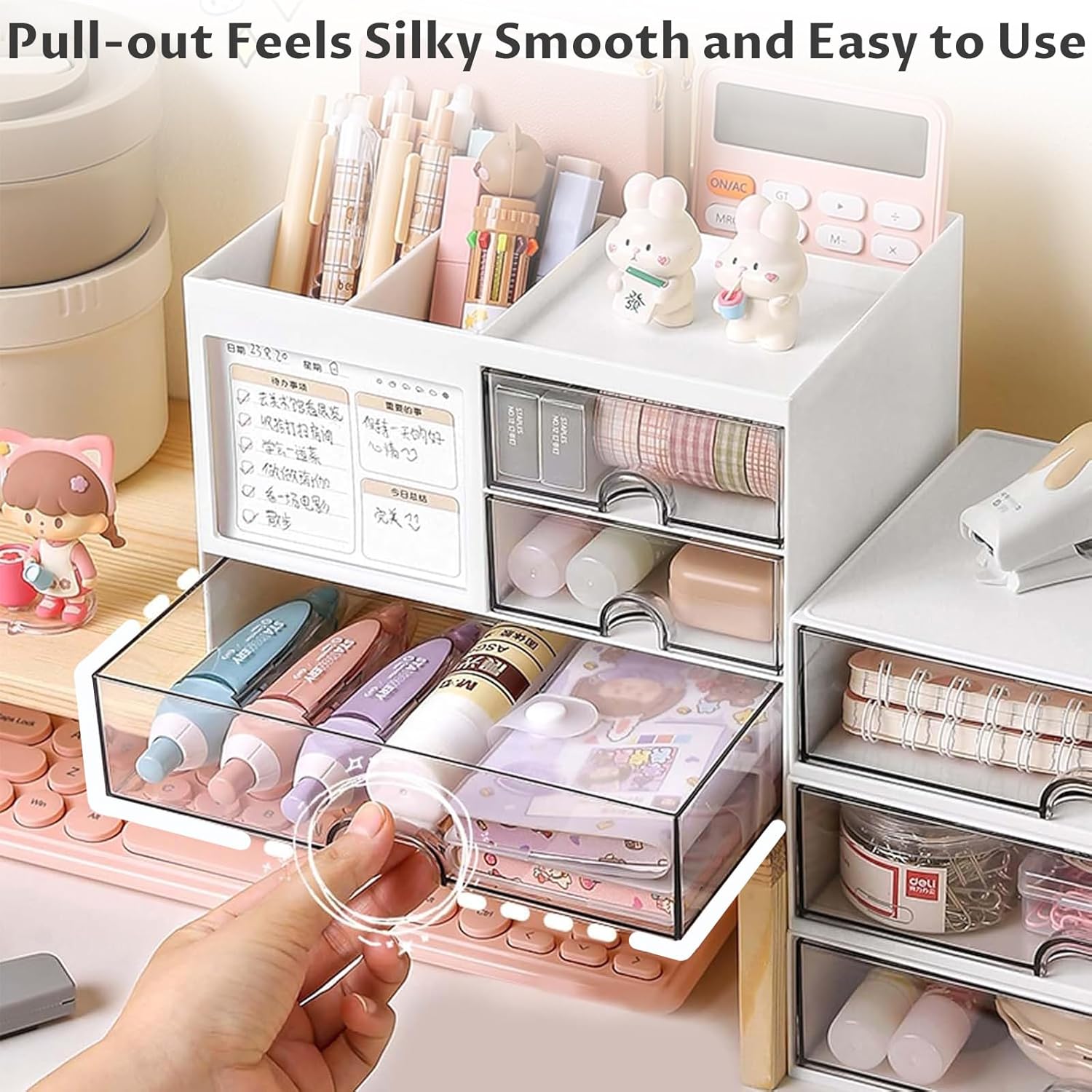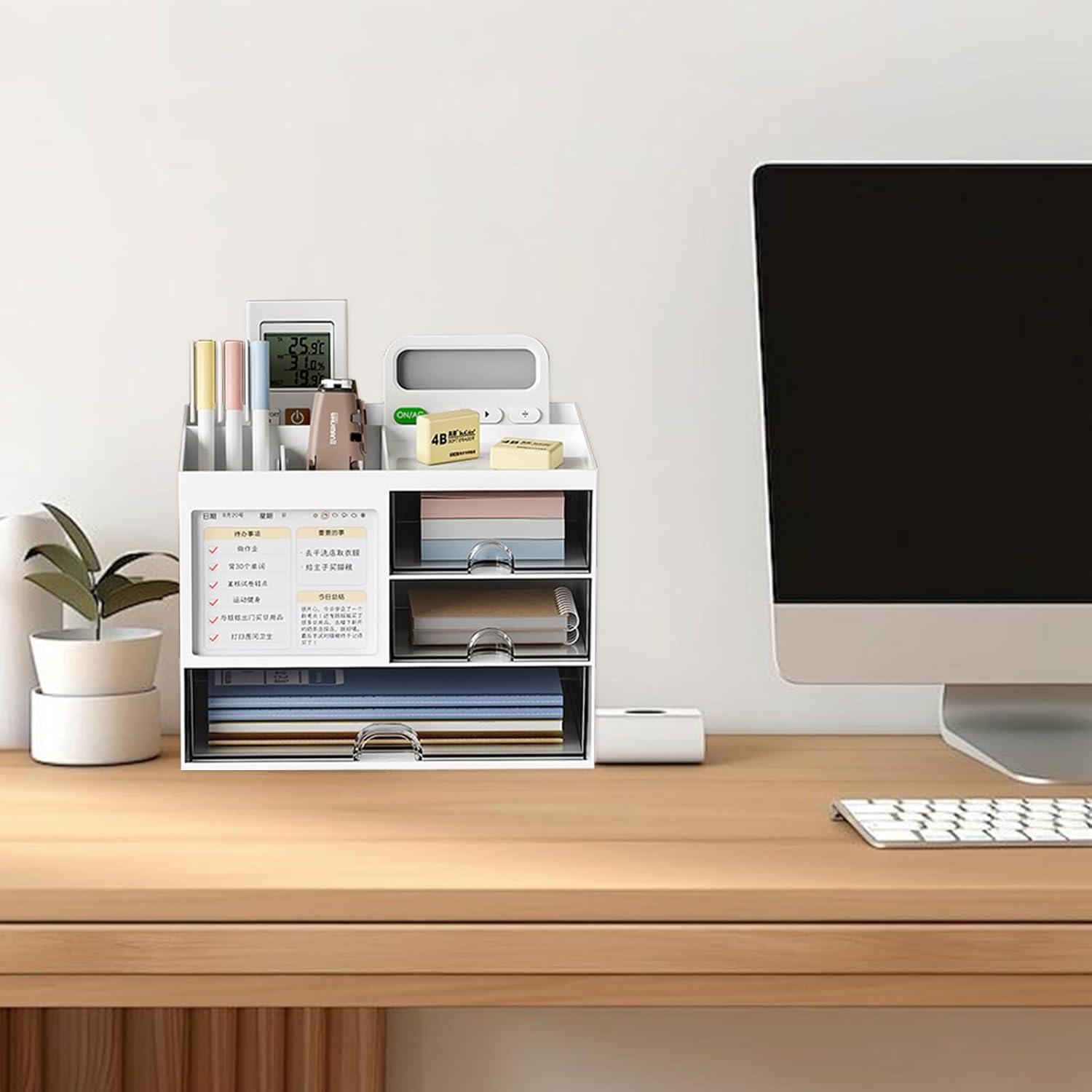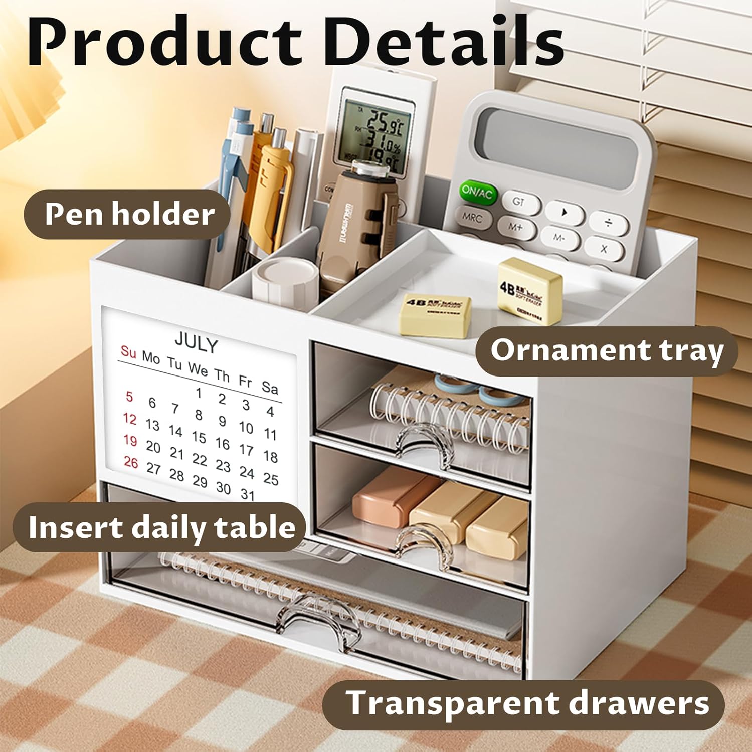 Design practic: Organizatorul de birou este echipat cu 4 compartimente și 3 sertare transparente, care pot sorta și stoca majoritatea articolelor de birou, vă mențin biroul curat și ordonat și economisiți timp pentru căutarea articolelor de care aveți nevoie.