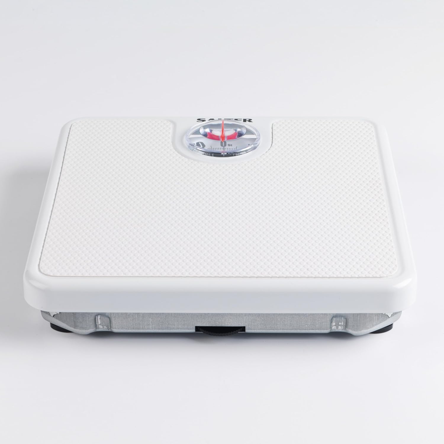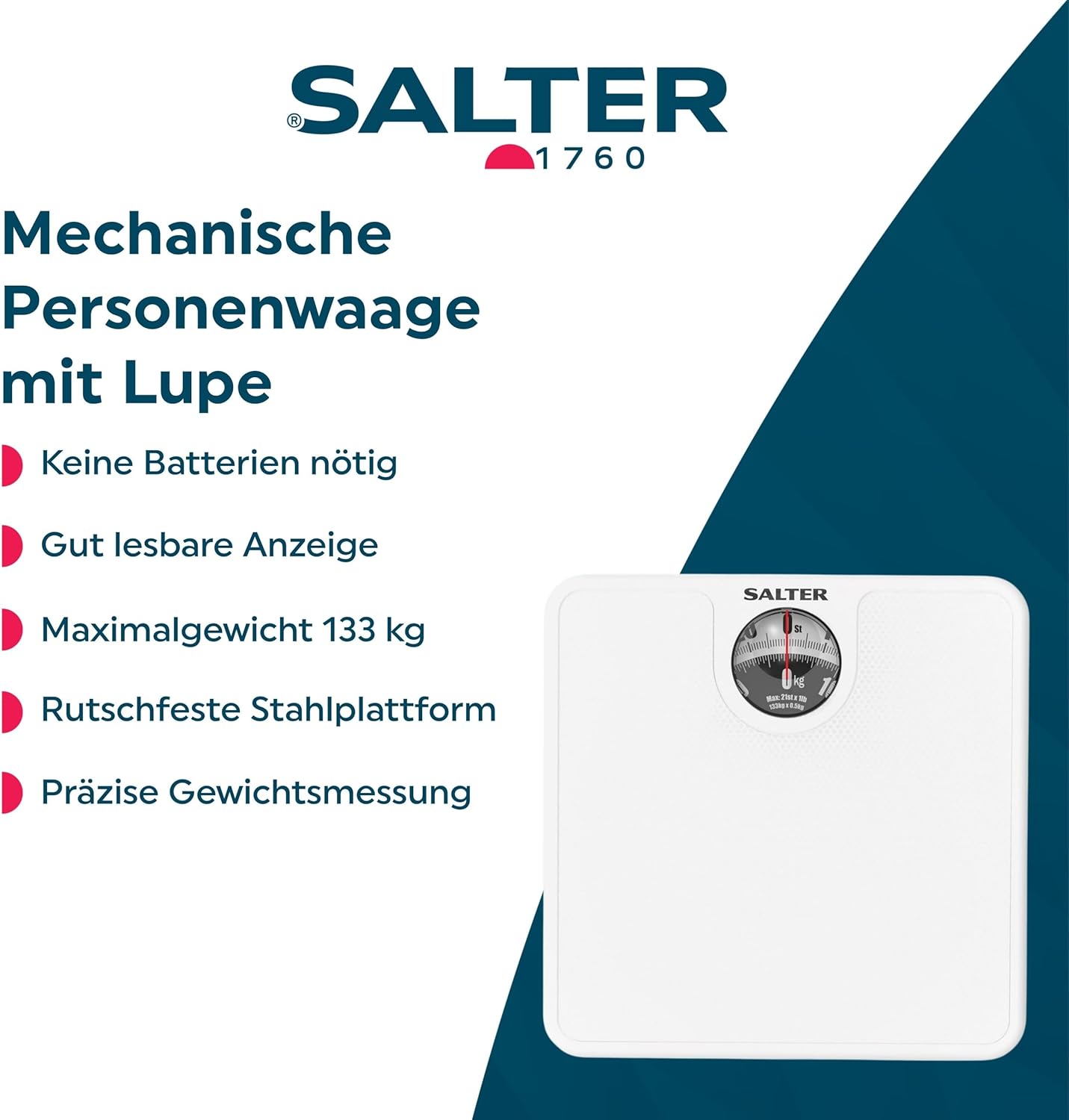 Cântar de baie mecanic Salter 489 WHDR - Afișaj cu lupă, ușor de citit, fără baterii, suprafață anti-alunecare. Capacitate maximă 133 kg, greutate precisă în kg, st/lbs. Cântar personal analogic tradițional, alb.