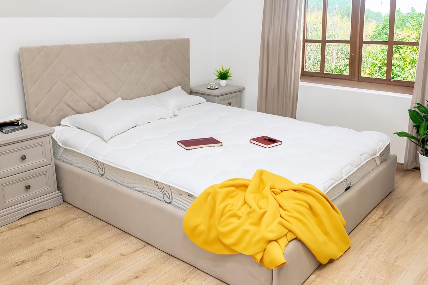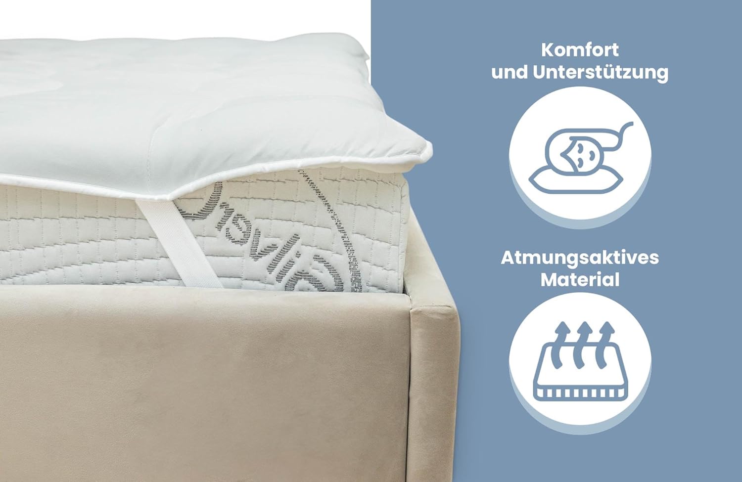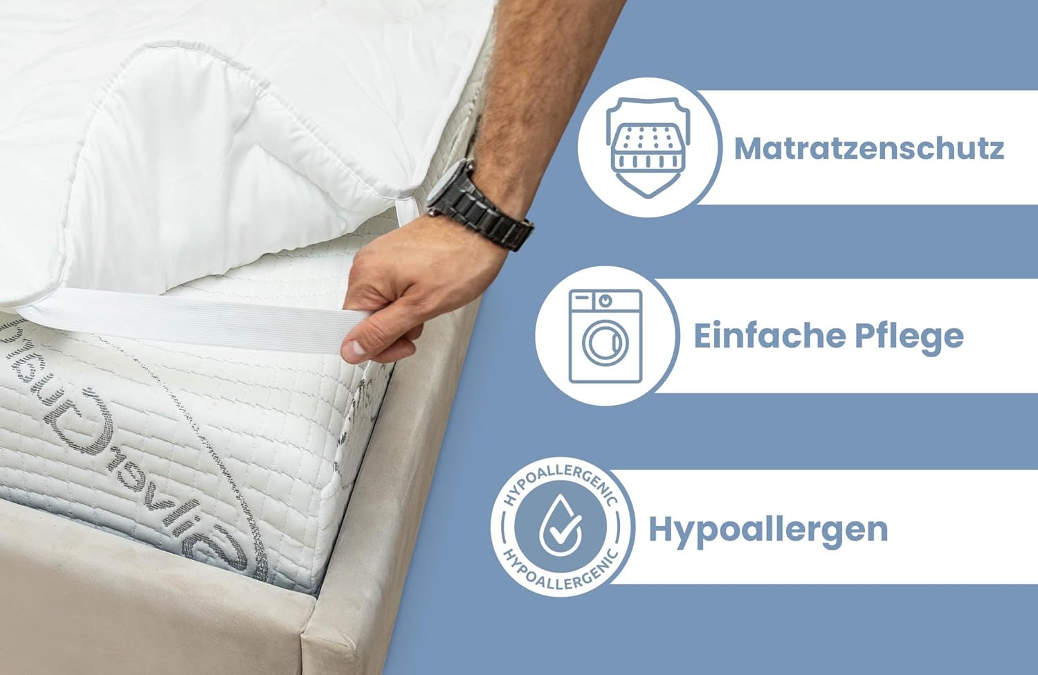 Protecția noastră pentru saltea oferă protecție maximă pentru salteaua dumneavoastră, asigurând în același timp confort maxim. Datorită manoperei de înaltă calitate, protejează împotriva umezelii, uzurii și prelungește durata de viață a saltelei. Protecția pentru saltea este ideală pentru familii, în special pentru casele cu bebeluși sau copii mici, deoarece servește perfect ca protecție pentru incontinență. Datorită materialului respirabil, salteaua rămâne uscată și răcoroasă, în timp ce suprafața moale asigură o senzație plăcută de somn. Protecția pentru saltea oferă o funcție fiabilă de protecție împotriva umezelii și este, bineînțeles, lavabilă la temperaturi ridicate, ceea ce o face ușor de întreținut. Gestionarea este facilitată de designul cearșafului cu elastic, care fixează în siguranță salteaua suplimentară pe saltea fără a aluneca. Topperul nostru nu este doar impermeabil, ci ideal și pentru paturile cu arcuri și toate celelalte tipuri de saltele. Datorită construcției sale robuste, protecția pentru saltea protejează împotriva petelor și uzurii, fără a compromite respirabilitatea. Baza se adaptează perfect corpului și susține coloana vertebrală pentru un somn odihnitor. Fie că este vorba de patul pentru copii, adulți sau persoane care au nevoie de dormitoare suplimentare pentru incontinență - această protecție pentru saltea oferă tot ce aveți nevoie pentru un somn igienic și confortabil. Protecția pentru saltea este ușor de întreținut și durabilă, ceea ce o face o parte indispensabilă a lenjeriei de pat. Protejați-vă salteaua cu protecția noastră versatilă și impermeabilă pentru saltea - partenerul perfect pentru un somn liniștit și confortabil zi de zi. Vă rugăm să rețineți: pot apărea mici variații de dimensiune (+/- 5%). Vă rugăm să rețineți: Nuanța de culoare poate varia ușor în funcție de lumina din fotografii (naturală/artificială), lotul de material sau setările monitorului.