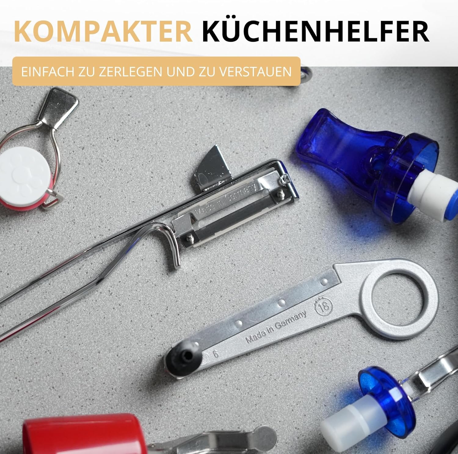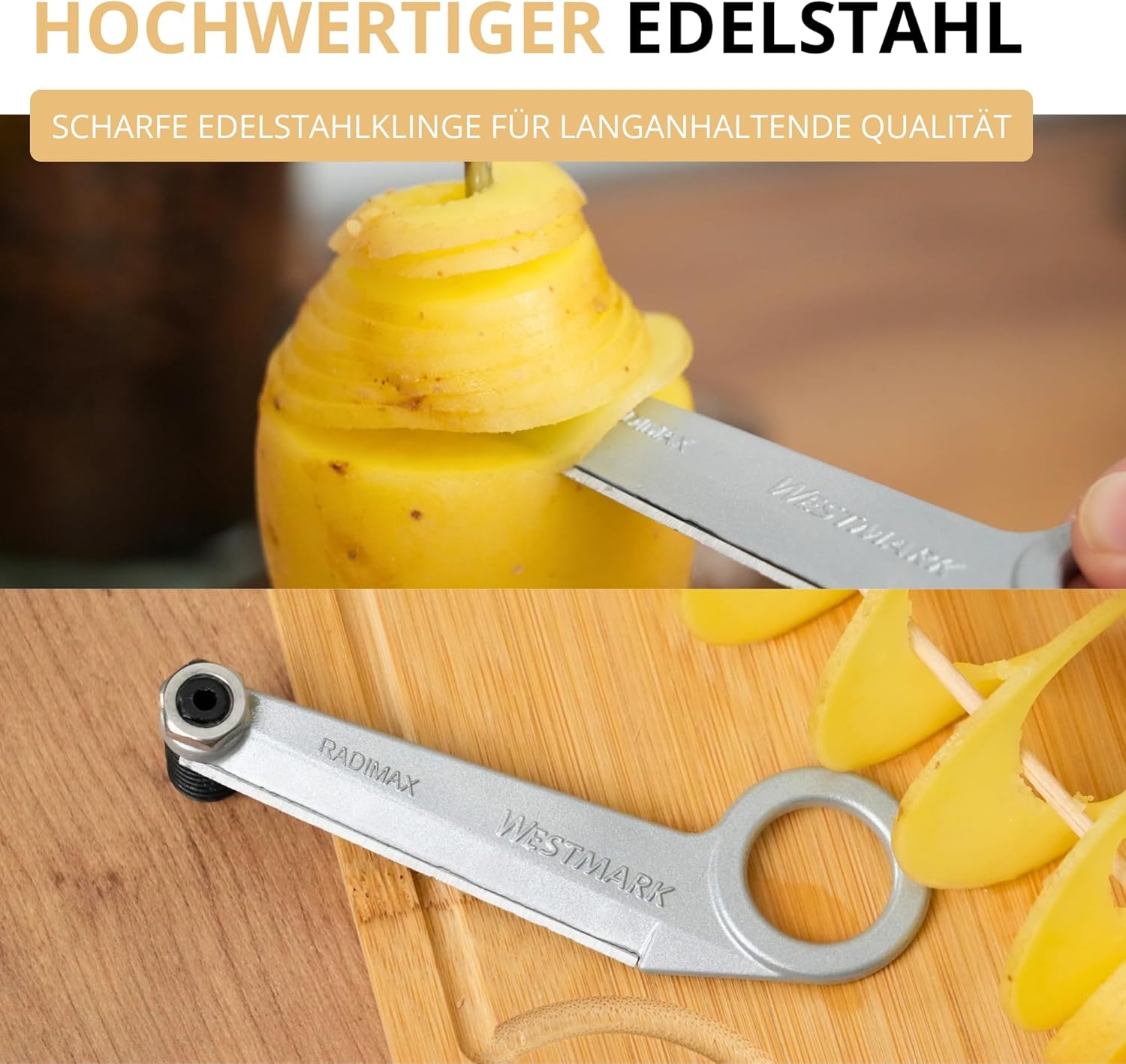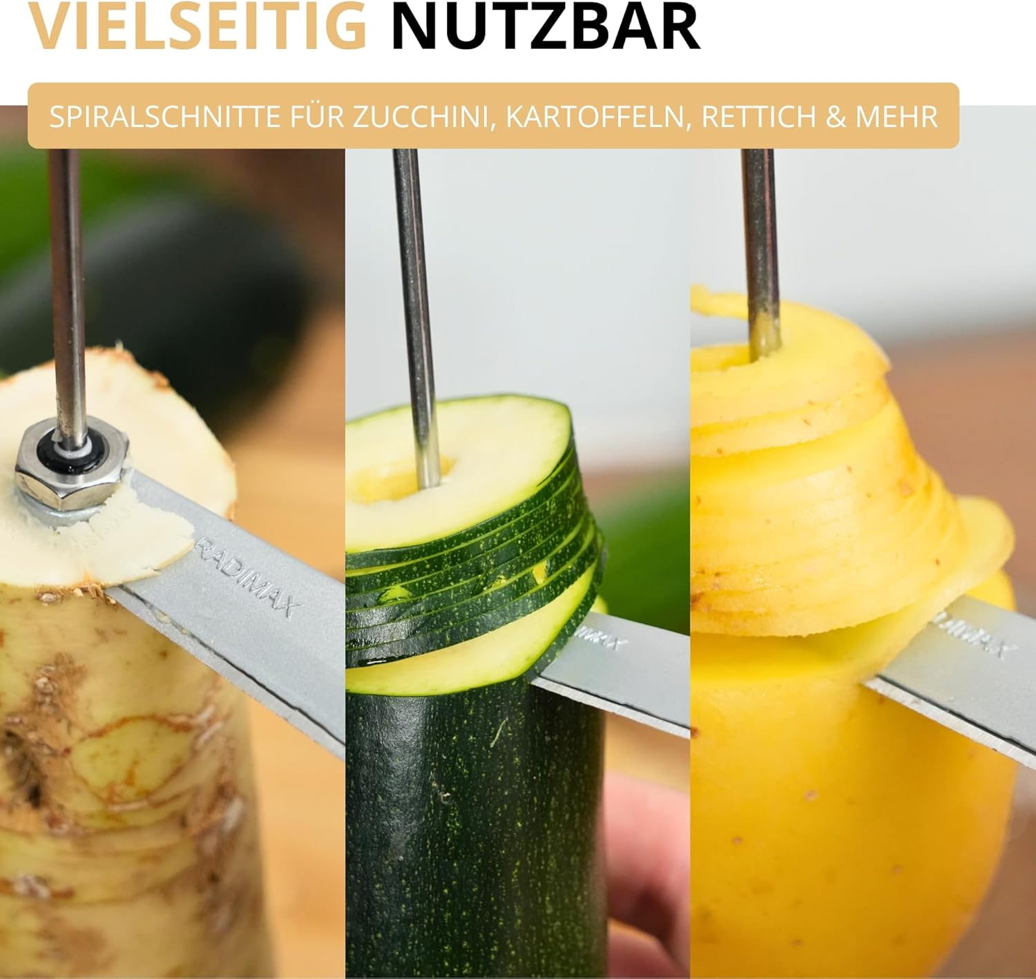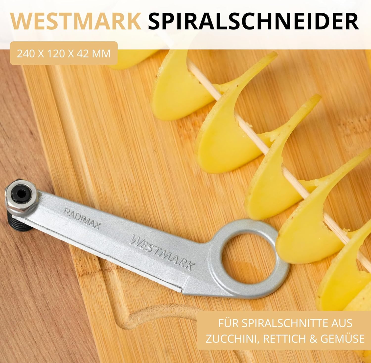 Feliator în spirală pentru realizarea de spirale din ridichi sau alte legume și fructe alungite, cum ar fi castraveți, dovlecei, vinete sau cartofi, pentru prezentarea individuală a alimentelor sau pentru chipsuri tornado. Tăiere fără efort a spiralelor decorative de legume datorită lamei de tăiere din oțel inoxidabil deosebit de ascuțită și a tijei de centrare foarte lungi pentru o tăiere curată și continuă a spiralei. Ușor de utilizat: centrați legumele cu tija de centrare, rotiți lama de tăiere în sensul acelor de ceasornic folosind bucla pentru degete. Fabricat în Germania; durabil, manoperă atentă și solidă, ușor de curățat, se poate spăla în mașina de spălat vase (se recomandă spălarea manuală pentru a asigura longevitatea lamei). Pachetul de livrare: 1x tăietor de ridichi Westmark, Radimax, dimensiuni: 24 x 12 x 4,2 cm, material: oțel inoxidabil/aluminiu, culoare: argintiu/gri, 51302260. Alte detalii despre produs.