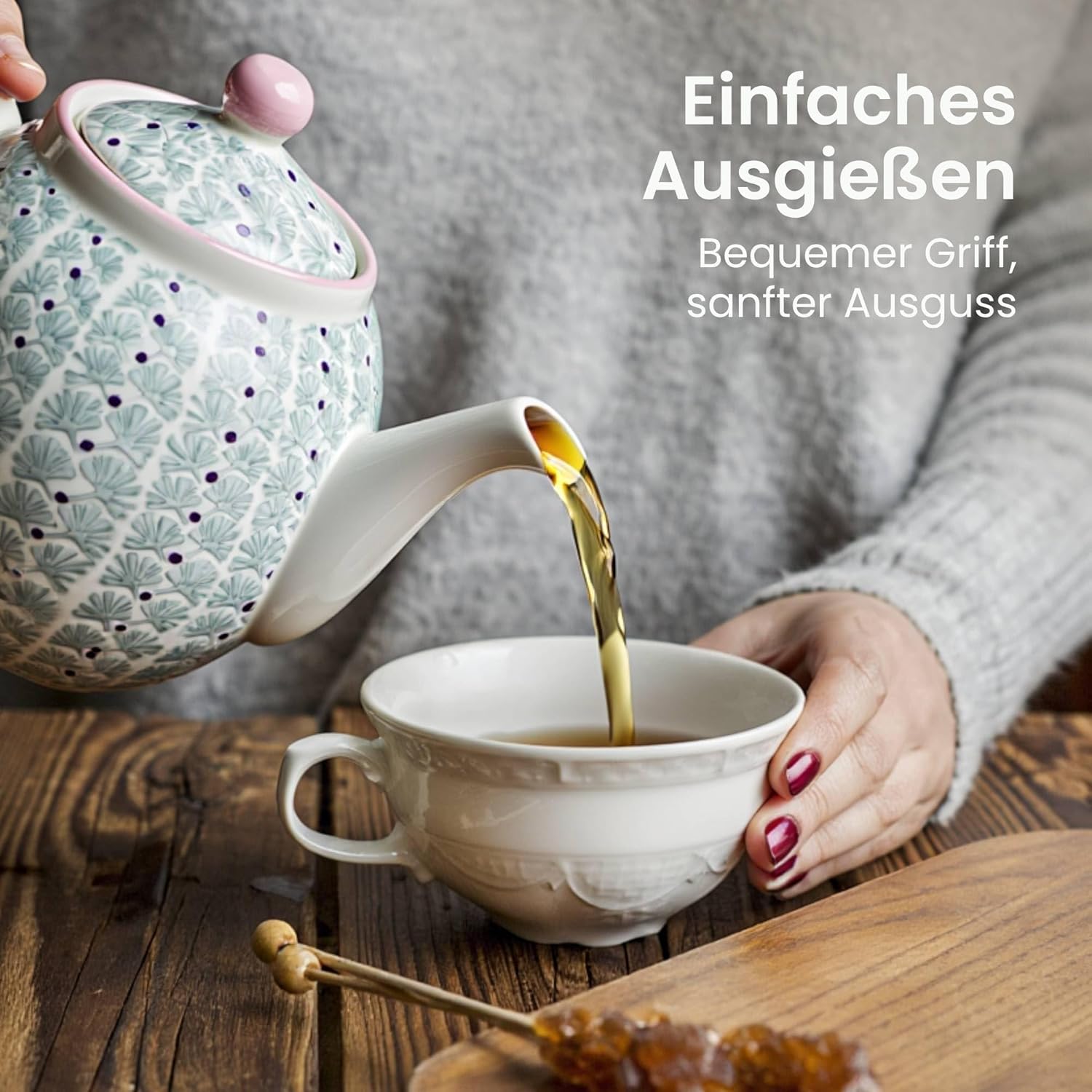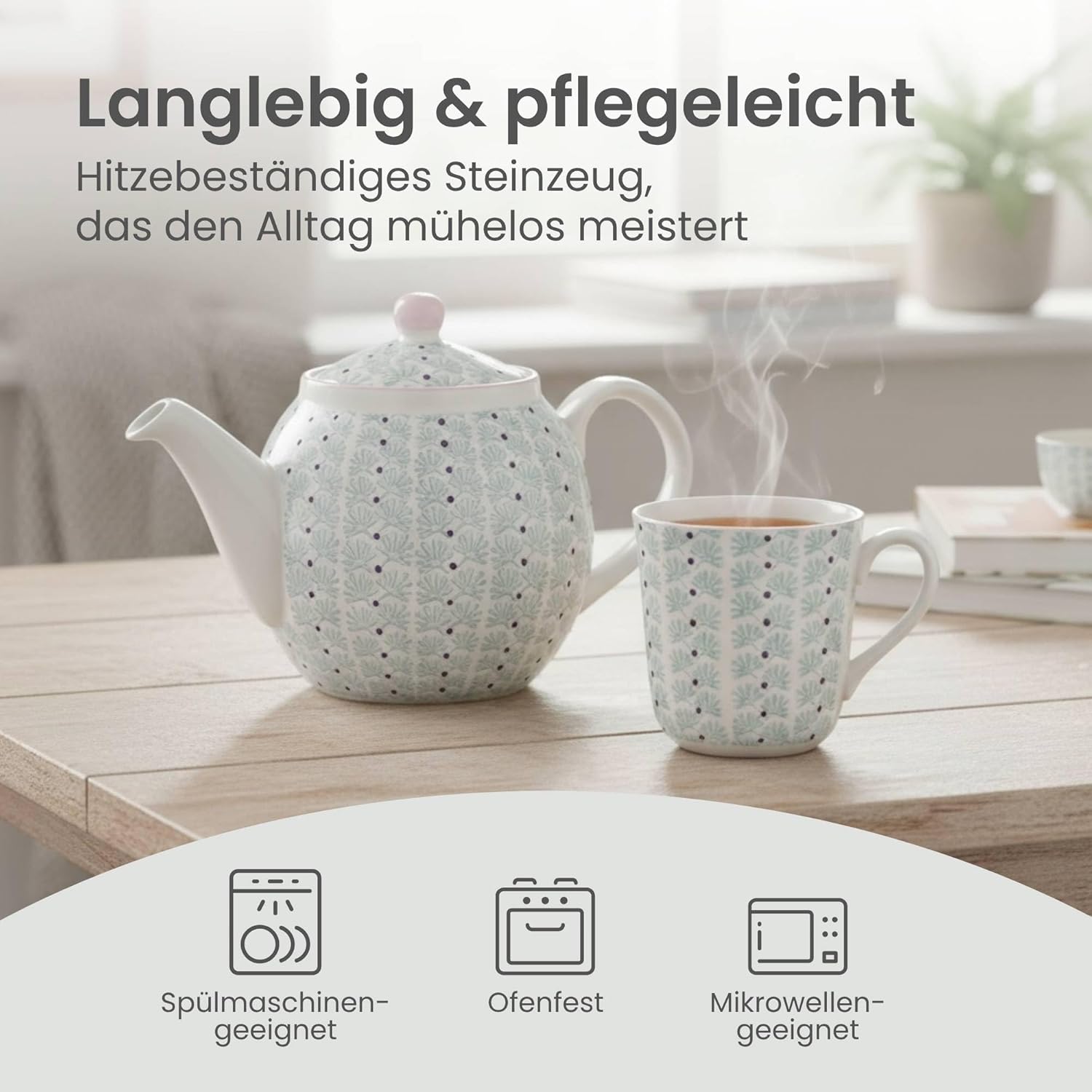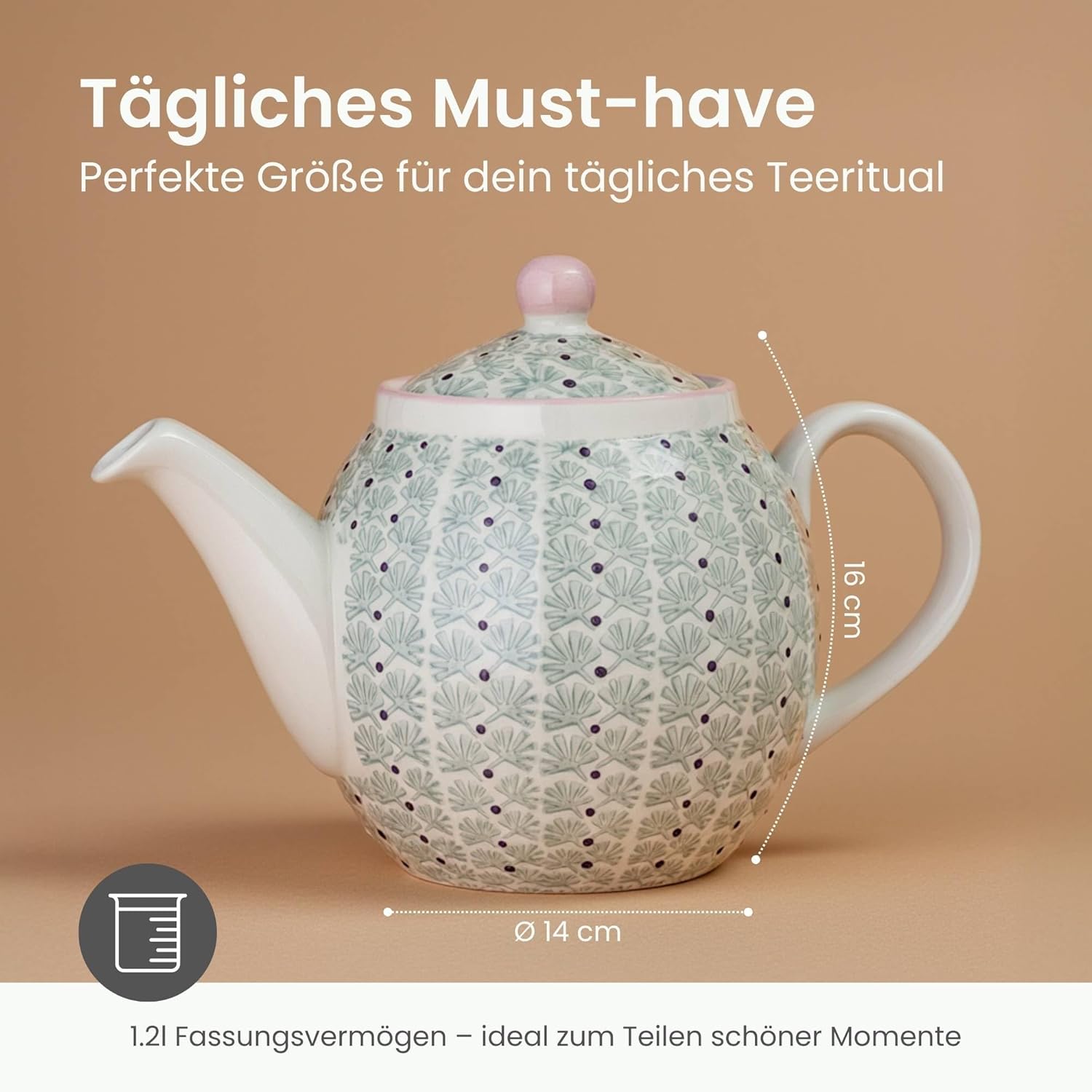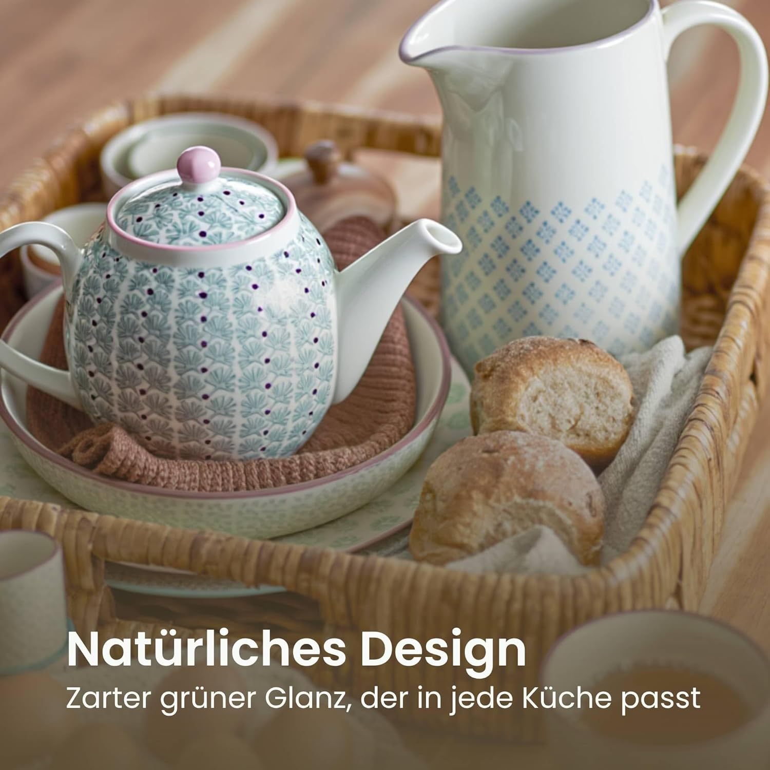 Ceainicul drăguț din gama Maya, cu modele de ștanțe lucrate manual în culori vii, aduce bucurie pe masă. Arată grozav pe masa de mic dejun sau la ceaiul de după-amiază. Modelul este în culori vii, cu buline mov, margine roz a capacului și frunze verde mentă. Material: ceramică, capacitate: 1,2 L, dimensiuni: diametru 24 cm x înălțime 16 cm, potrivit pentru mașina de spălat vase, cuptor și cuptor cu microunde.