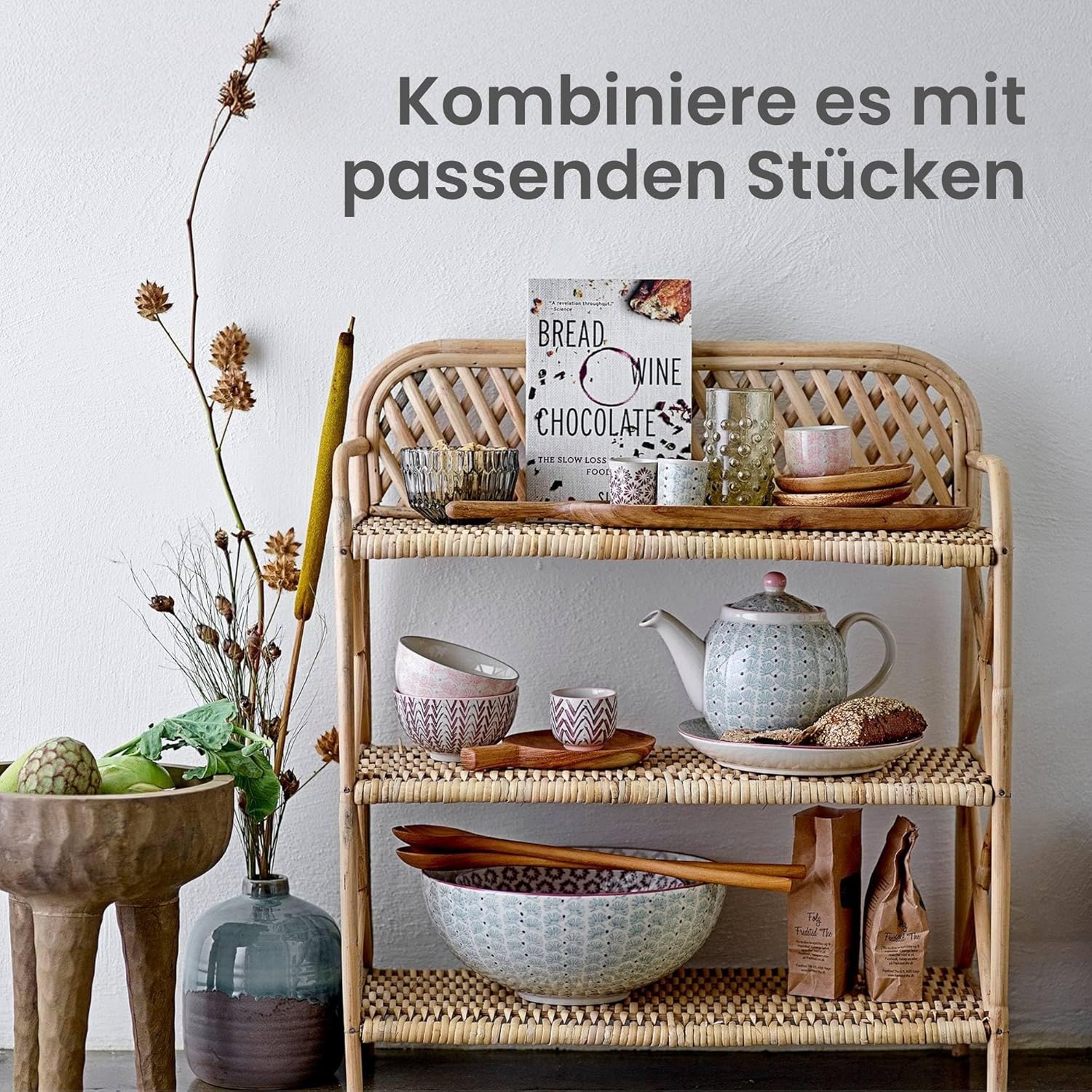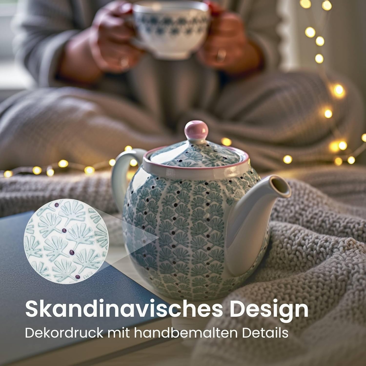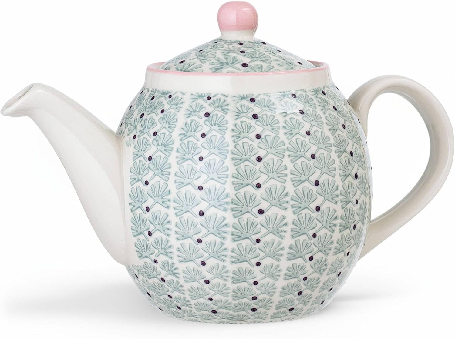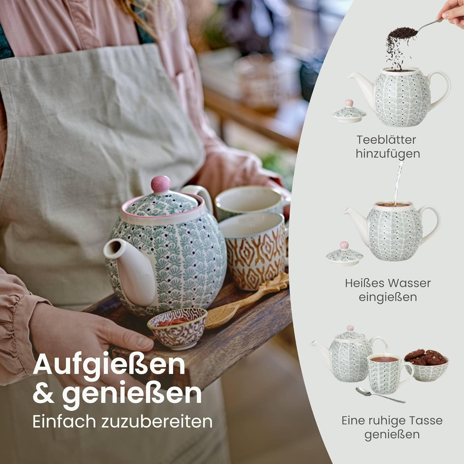 Ceainicul drăguț din gama Maya, cu modele de ștanțe lucrate manual în culori vii, aduce bucurie pe masă. Arată grozav pe masa de mic dejun sau la ceaiul de după-amiază. Modelul este în culori vii, cu buline mov, margine roz a capacului și frunze verde mentă. Material: ceramică, capacitate: 1,2 L, dimensiuni: diametru 24 cm x înălțime 16 cm, potrivit pentru mașina de spălat vase, cuptor și cuptor cu microunde.