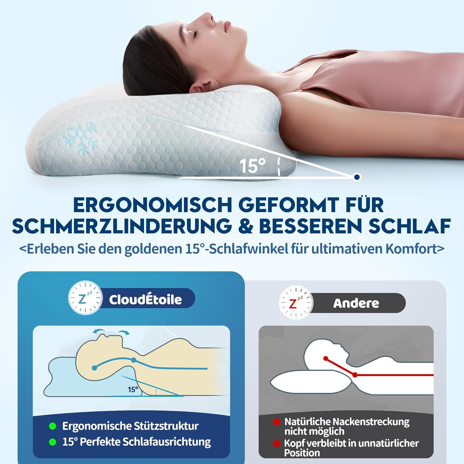 Despre acest produs Pernă în formă de fluture: Noua pernă din spumă cu memorie CloudÉtoile este proiectată în formă de fluture. Înclinarea de 15 grade oferă suport uniform pentru cap, astfel încât această pernă vă menține gâtul într-o poziție naturală și promovează o postură relaxată. Astfel încât să puteți adormi rapid și să vă treziți odihnit în fiecare zi Designul 2 în 1 al acestei perne este ingenios gândit: o parte susține ergonomic gâtul, în timp ce cealaltă parte este mai plată și perfectă pentru a vă întinde pe o parte sau pe burtă. Perna ergonomică oferă suport stabil și confort maxim. Și această pernă ergonomică a fost special dezvoltată pentru cei care dorm pe o parte și pentru iubitorii de perne ferme și oferă confort optim în orice poziție de dormit Pernă cu spumă cu memorie de înaltă densitate, CertiPUR-US: Perna cu spumă cu memorie este umplută cu spumă cu memorie 50D de înaltă densitate și, datorită rezistenței sale excelente, perna se adaptează cu precizie contururilor capului și gâtului și oferă sprijin ferm și stabil, indiferent dacă dormiți pe spate sau pe o parte. (Notă: Mirosul ușor al unei perne noi este normal, inofensiv și se disipează rapid. Toate pernele noastre sunt certificate și îndeplinesc cele mai înalte standarde de sănătate și mediu). Husă de pernă certificată OEKO-TEX: Husa textilă a pernei strălucește în orice lumină și prezintă un design subtil de fulgi de zăpadă în albastru, care completează cu stil zona dvs. de dormit. Stratul de suprafață al husei este echipat cu o tehnologie inovatoare, de răcire, care asigură un somn proaspăt, răcoros și confortabil. Vă rugăm să curățați husa detașabilă la o temperatură sub 40 de grade pentru a proteja în mod optim calitatea și funcționalitatea acesteia Perne din spumă cu memorie CloudÉtoile - confort în somn ca pe nori: De 21 de ani, CloudÉtoile dezvoltă perne din spumă cu memorie personalizate în funcție de obiceiurile de somn ale oamenilor. Somnul este una dintre cele mai importante activități umane. Sperăm că pernele noastre vă vor ajuta să vă îmbunătățiți calitatea somnului. Dormiți confortabil ca într-un univers infinit, înconjurat de stele sclipitoare. Somn profund și odihnitor în fiecare noapte! 120 de nopți de încercare - Garanție de 10 ani: Susținem fiecare decizie. Primiți o garanție de 10 ani și un serviciu clienți local în Germania. Puteți testa această pernă timp de 120 de nopți - gâtul dvs. vă va mulțumi. Asistență tehnică în limba germană, 6 zile / săptămână prin chat / e-mail. Înlocuire gratuită pentru defecte de fabricație. Notă: Rezultatele pot varia. Nu pentru uz medical. Pentru tulburări de somn, vă rugăm să consultați un medic. Alte detalii despre produs