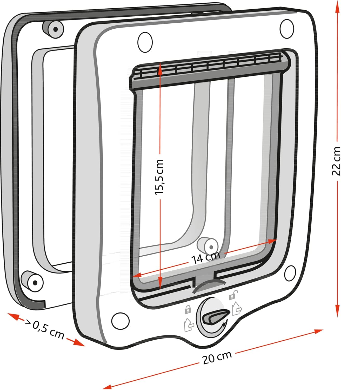 Informații despre acest articol Fabricat din plastic robust și ușor de întreținut. Clapeta de acces transparentă îi permite pisicii dvs. să intre și să iasă deosebit de silențios. Datorită unei garnituri circumferențiale TPR, intrarea rămâne uscată chiar și în ploaie. Următoarele patru "setări" pot fi făcute cu ajutorul încuietorii cu răsucire: Deschis; Închis; Doar intrare; Doar ieșire. Dimensiuni: Adâncime de instalare de cel puțin 5 mm; dimensiuni totale 20 × 22 cm; decupaj 15,9 × 16,8 cm; dimensiunea clapetei 14 × 15,5 cm. Alte detalii despre produs.