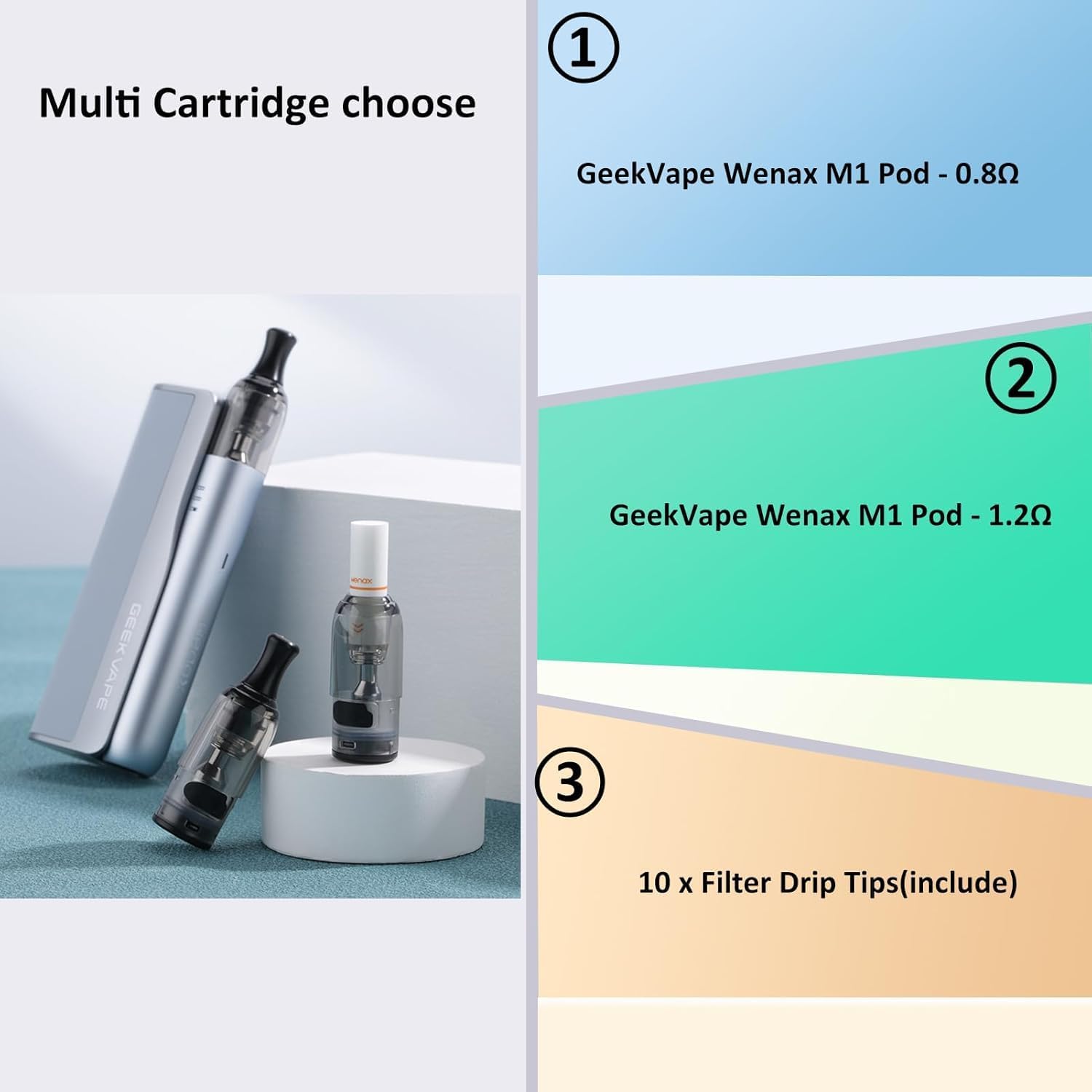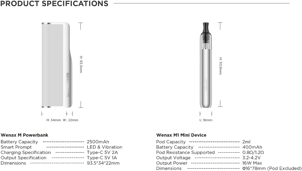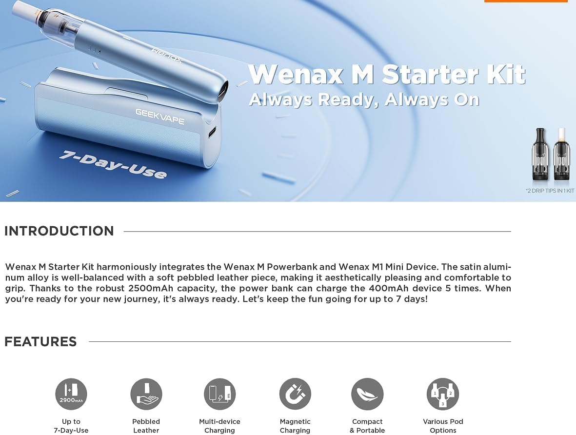 Geekvape Wenax M1 Mini Kit: Dispune de o baterie de 400 mAh, ajustare automată a puterii până la 16W și un sistem de conectare Plug n Play pentru schimbarea ușoară a pod-urilor.