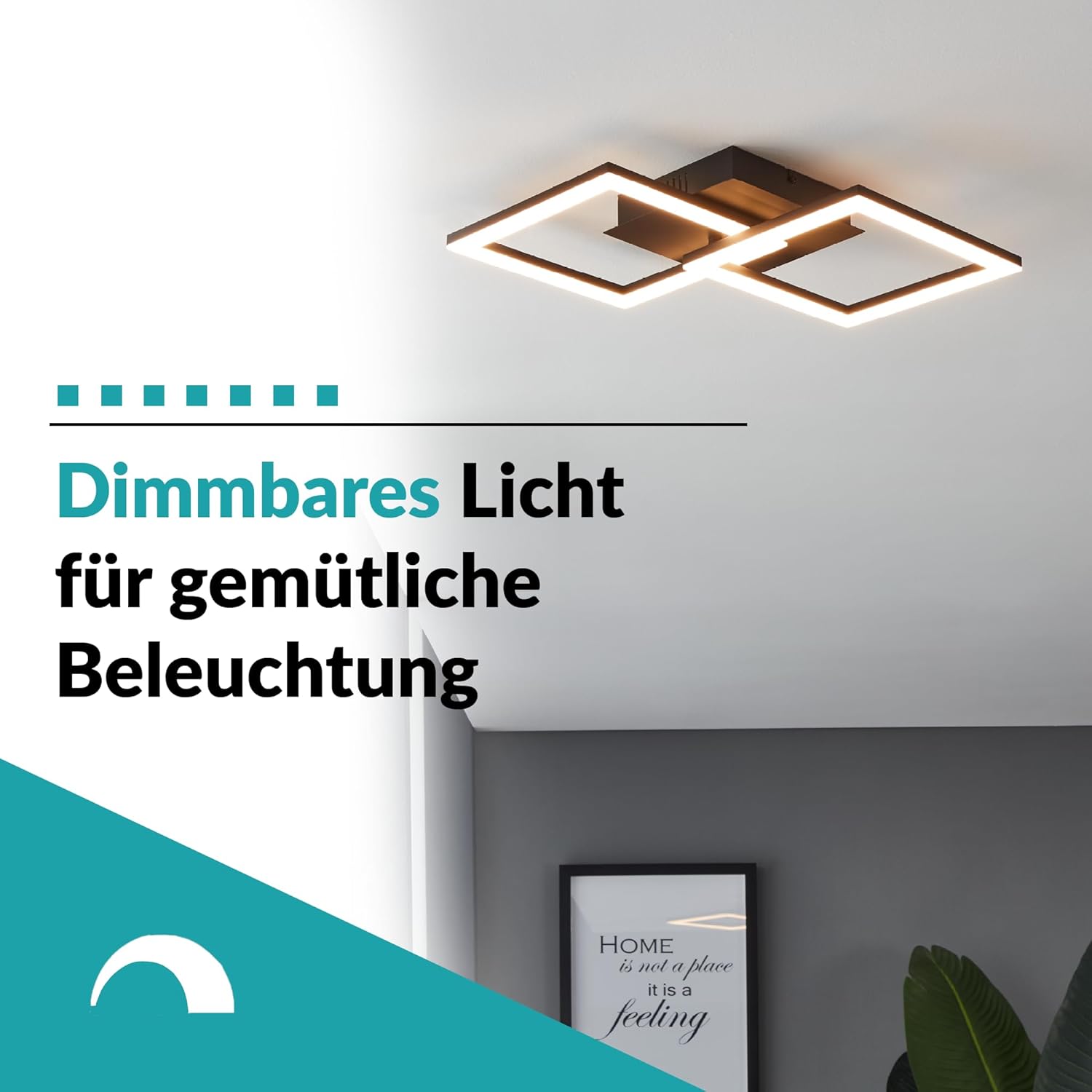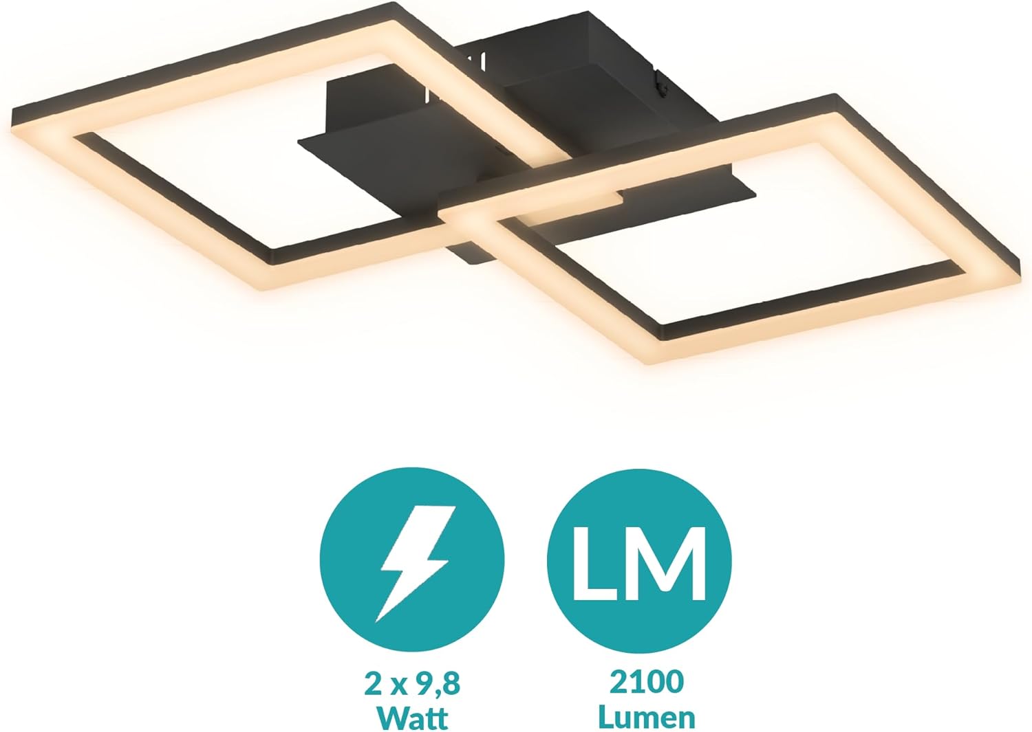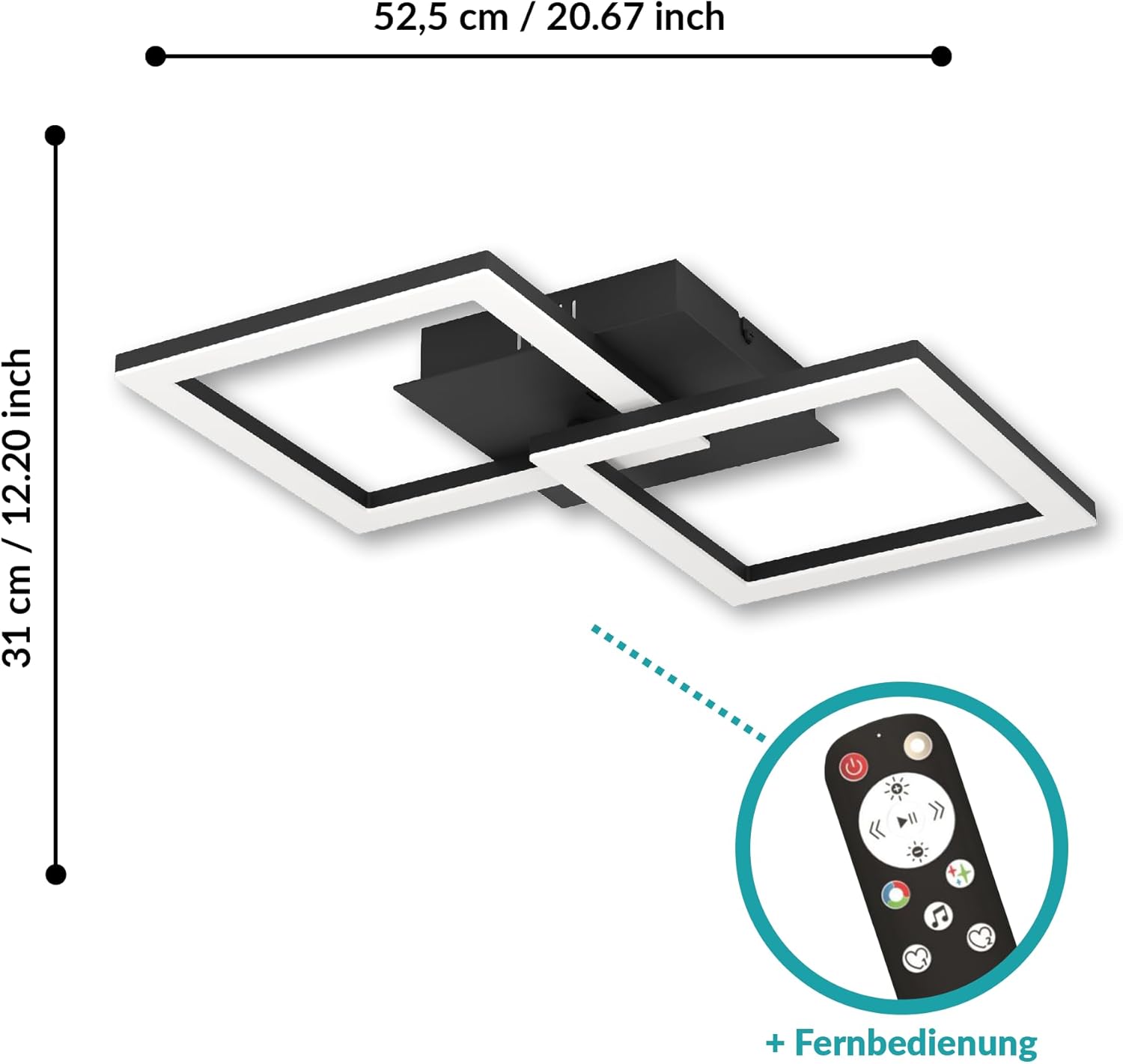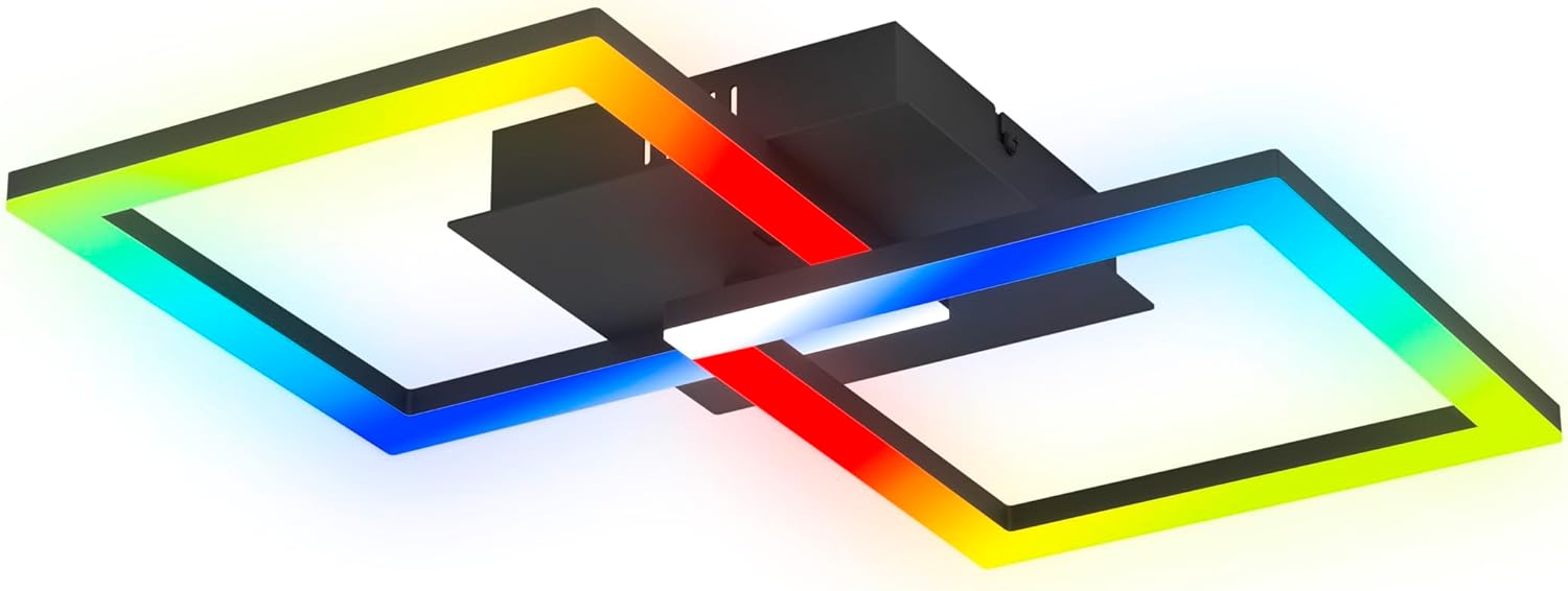 Despre acest produs Lampa LED pentru perete și tavan din seria RGBIC este fabricată din aluminiu negru și are două elemente de iluminare pătrate care oferă iluminare atmosferică în orice cameră Lampa este ideală ca iluminare ambientală în camera de zi sau în dormitor, ca gadget pentru camera de jocuri și ca iluminare pentru petreceri Telecomanda furnizată poate fi utilizată pentru a seta lumina albă caldă și o varietate de tonuri de culoare RGB (2X 9,8 wați, 3000 Kelvin, 2100 lumeni) și pentru a salva preferințele personale; iluminarea ambientală creează efecte de lumină în mișcare datorită diferitelor moduri de muzică Dacă telecomanda nu este conectată direct după aprindere, țineți apăsat butonul on timp de aprox. 3 secunde Dimensiuni: Lungime: 52,5 cm, lățime: 31 cm, înălțime: 8 cm; Acest produs este un produs înconjurător cu o sursă de lumină din clasa de eficiență energetică E; Produsele înconjurătoare sunt lumini care pot fi demontate pentru a verifica sursa (sursele) de lumină conținute separat Alte detalii despre produs