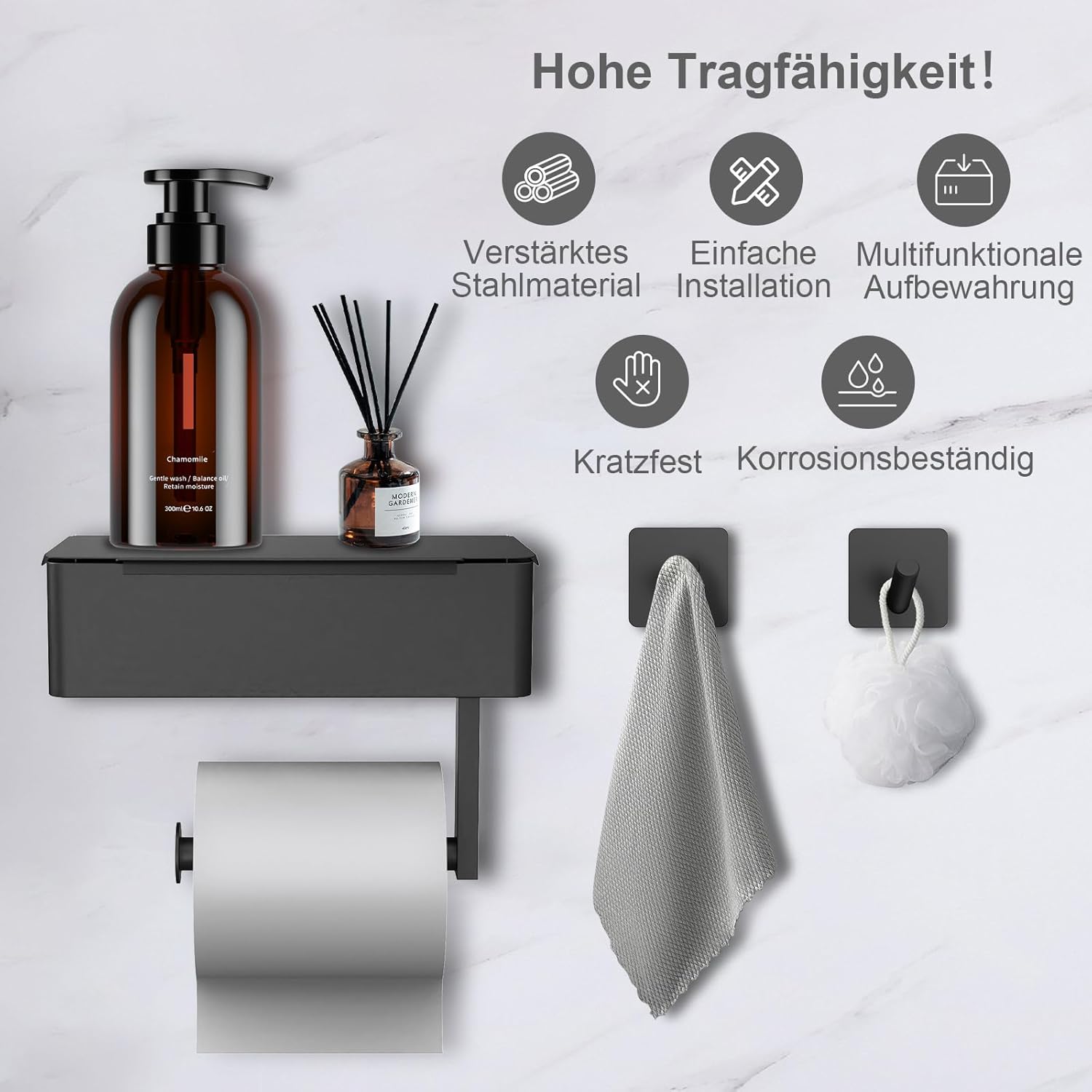 Funcție 3 în 1: suport pentru hârtie igienică, raft depozitare și loc pentru accesorii