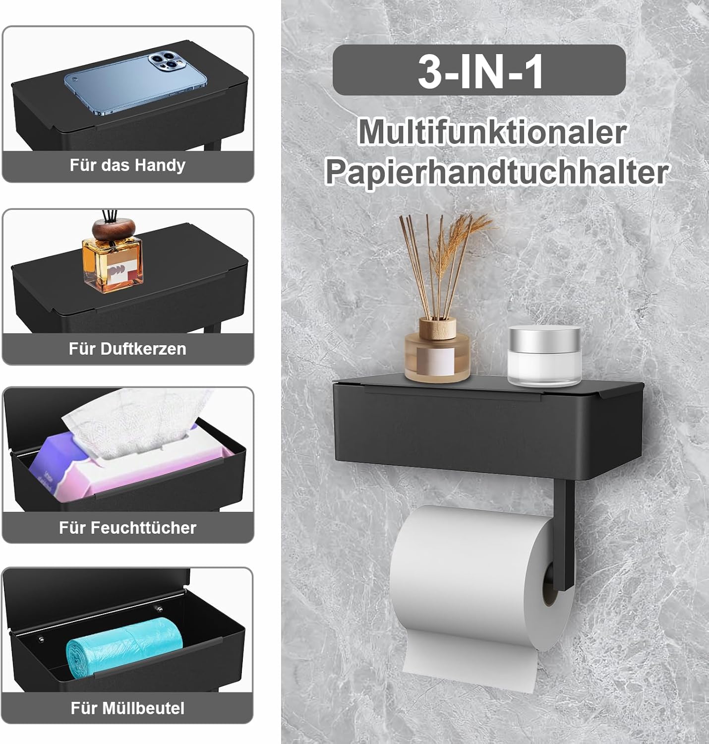Suportul de hârtie igienică 3 în 1 combină funcționalitatea cu stilul, oferind soluția ideală pentru un spațiu ordonat și practic.