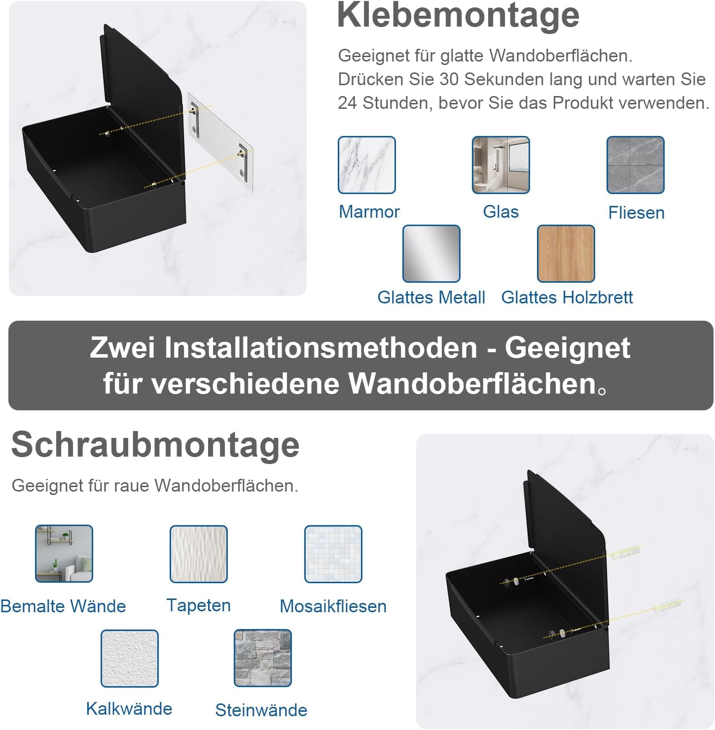 Montaj simplu fără forare, adeziv pe spate pentru suprafețe netede (gresie, sticlă, inox, marmură)