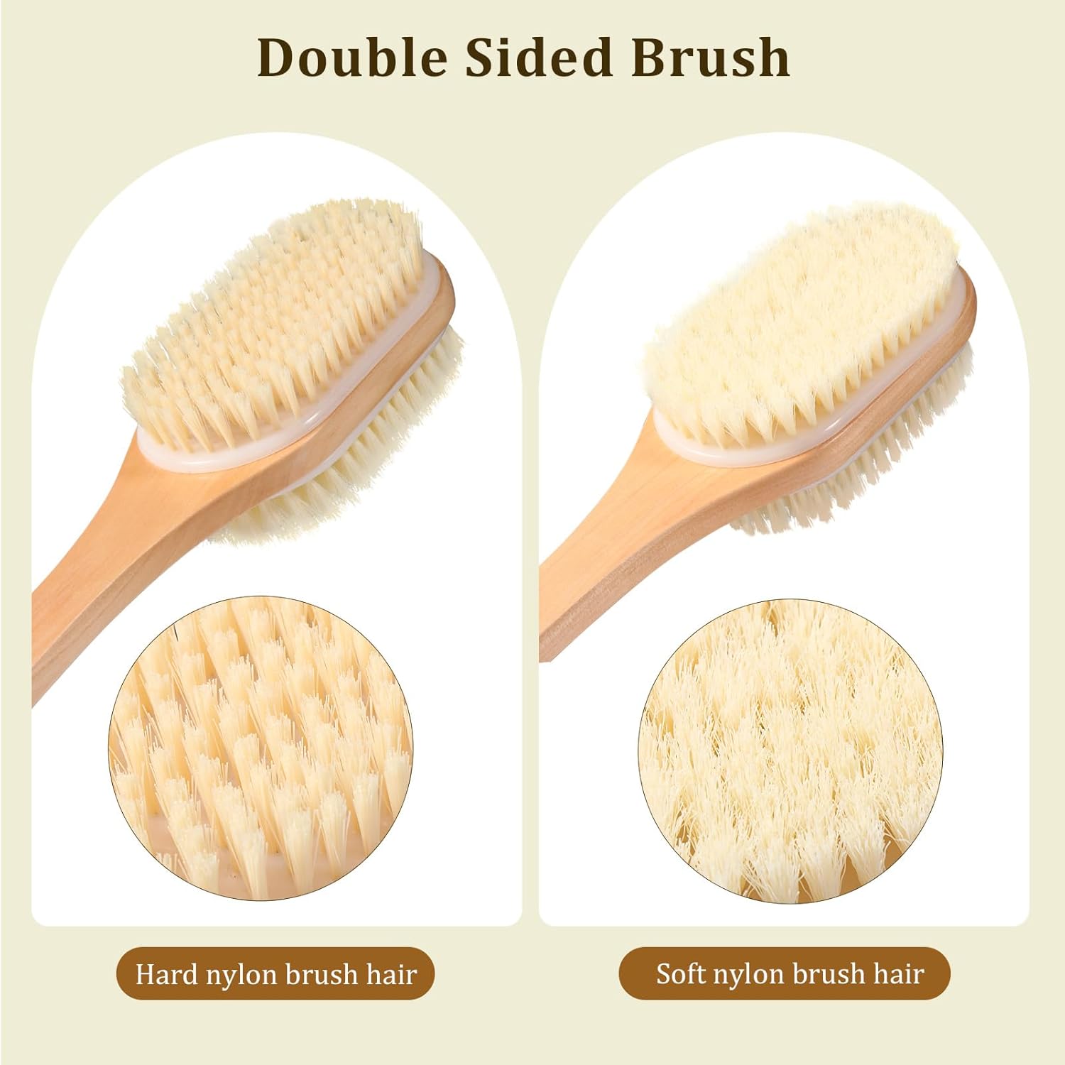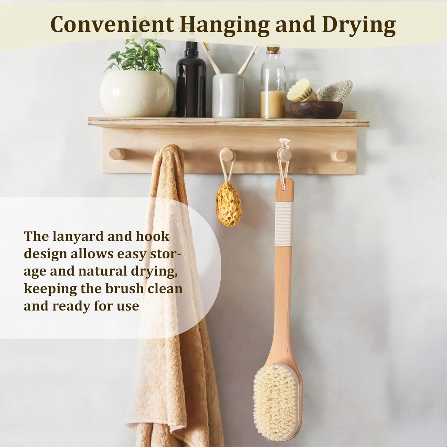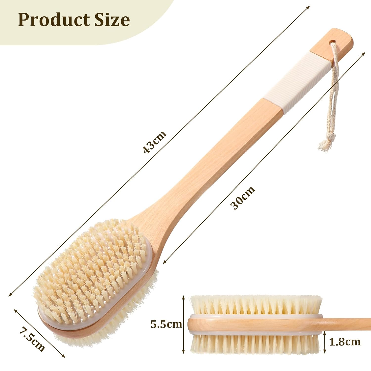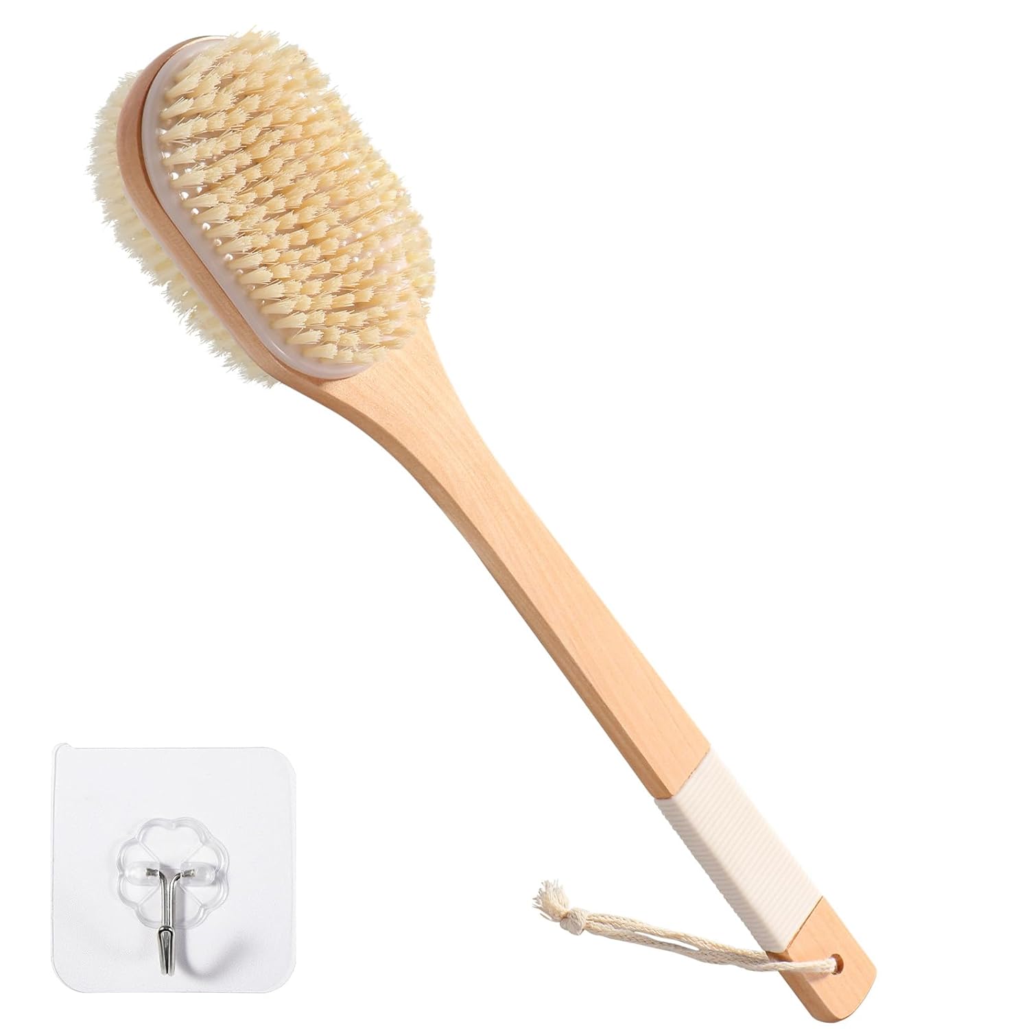 Perie de baie pentru spate cu mâner lung, pentru aplicare uscată și umedă. Această perie exfoliantă pentru spate nu servește doar ca o perie de duș pentru curățarea și îndepărtarea murdăriei și a celulelor moarte ale pielii în timpul dușului, ci și ca o perie de masaj pentru utilizare zilnică, pentru a stimula ganglionii limfatici și a promova circulația pielii. Material: Peria de duș dispune de două tipuri de peri – o parte cu peri naturali și cealaltă cu peri elastici din PP, care își păstrează forma. Mânerul este din lemn dur și este durabil, evitând astfel modificările materialului. Mâner lung: Cu o lungime de 43 cm, peria de spate pentru duș permite o curățare ușoară a spatelui, picioarelor și a zonelor greu accesibile. Design ergonomic: Peria de spate este echipată cu un mâner antiderapant, care asigură o prindere confortabilă și sigură. Depozitare ușoară: Mânerul periei de duș este prevăzut cu o buclă de agățare și vine cu un cârlig autoadeziv pentru o depozitare și organizare ușoară.