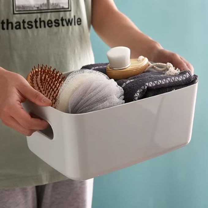 Descriere produs:Set de 4 bucăți: Conține 4 cutii de depozitare care pot fi stivuite una în alta atunci când nu sunt utilizate, economisind spațiu. Dimensiuni: Coșul de depozitare măsoară 25 x 17 x 10 cm, ideal pentru organizarea și depozitarea obiectelor mici și medii acasă, la birou sau în bucătărie. Robust și durabil: Aceste cutii organizatoare sunt fabricate din plastic de înaltă calitate, ușoare, foarte rezistente și durabile. Le puteți utiliza oriunde, cum ar fi în bucătărie, dulap, frigider, spălătorie, dormitor, baie, birou, garaj etc. Mânere laterale: Pe marginile coșului există mânere pentru transportul și accesul ușor la obiecte. O opțiune excelentă pentru transportul articolelor pentru petreceri de familie și evenimente în aer liber. Atenție la curățare: Această cutie de depozitare nu este sigură pentru mașina de spălat vase, vă rugăm să nu o introduceți în mașina de spălat vase. Vă rugăm să o curățați manual cu săpun sau apă.