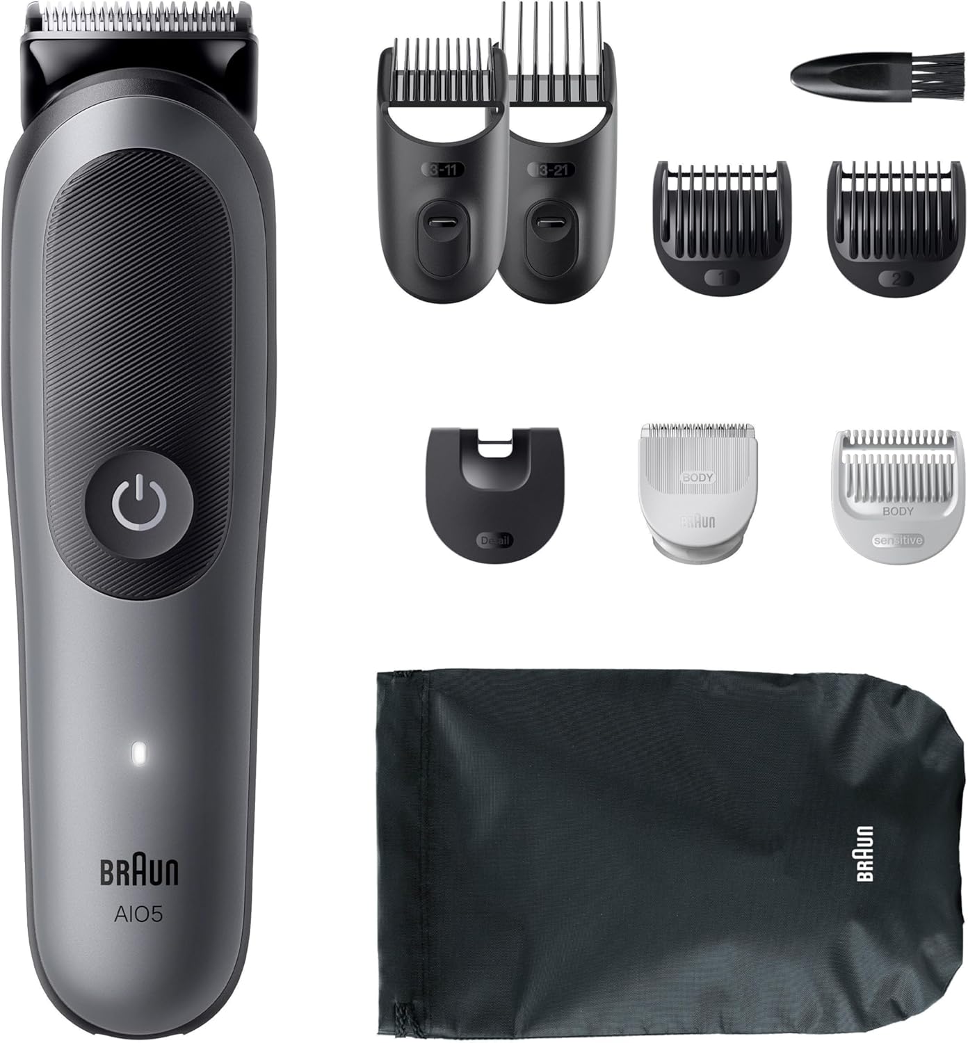Set de îngrijire all-in-one Braun 9-în-1: Stil nelimitat din cap până în picioare. Include instrumente atent selecționate pentru tunderea bărbii, tuns și îngrijirea corpului. Versatilitate ridicată: Lama ultra-ascuțită asigură precizie, eficiență și confort în îngrijirea întregului corp. Delicat cu pielea sensibilă: Tehnologia SkinGuard oferă siguranță și confort maxim chiar și în zonele sensibile ale corpului. Control absolut: AIO5 oferă 14 setări de lungime (3-21 mm) pentru rezultate excepționale de styling. Durabil: 100% impermeabil cu mâner AquaGrip pentru control absolut, chiar și sub duș. Bateria Li-Ion de lungă durată oferă o autonomie wireless de până la 120 de minute.