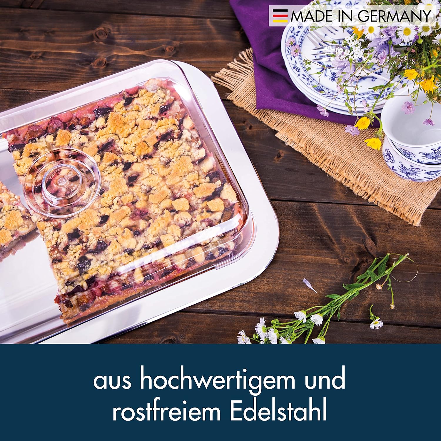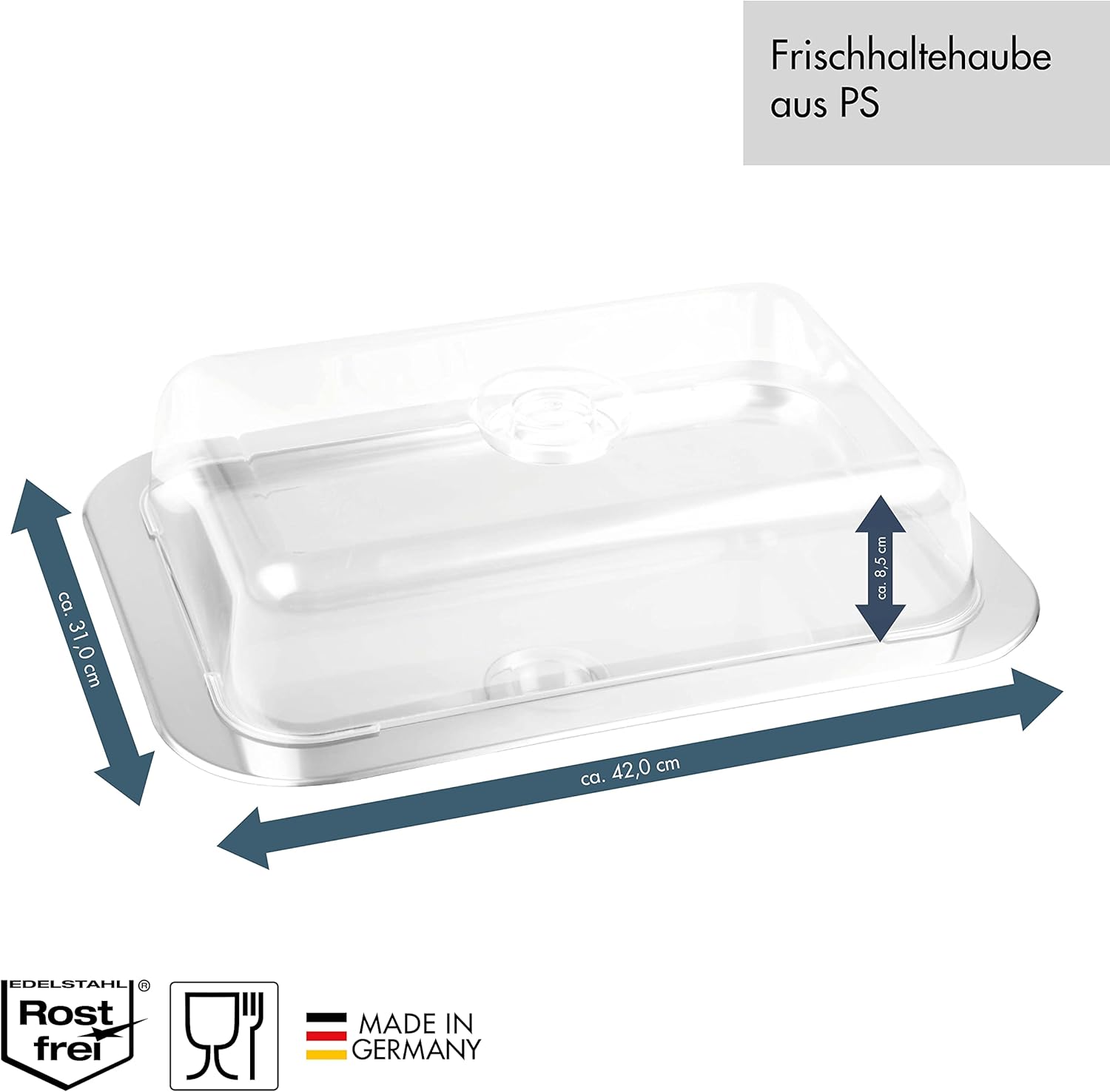 Informații despre acest articol: Platou gourmet de înaltă calitate din oțel inoxidabil pentru servirea atractivă a gustărilor, prăjiturilor, tartelor și multe altele. Funcție 2-în-1: Servire elegantă și depozitare practică într-unul singur. Calitate Made in Germany: Fabricat din oțel inoxidabil de înaltă calitate, rezistent la rugină. Ușor de întreținut: ușor de curățat, lavabil în mașina de spălat vase (nu și cupola de prospețime), fără gust. Conținutul livrării: 1x platou de prospețime din oțel inoxidabil cu cupolă de prospețime din plastic. Mai multe detalii despre produs