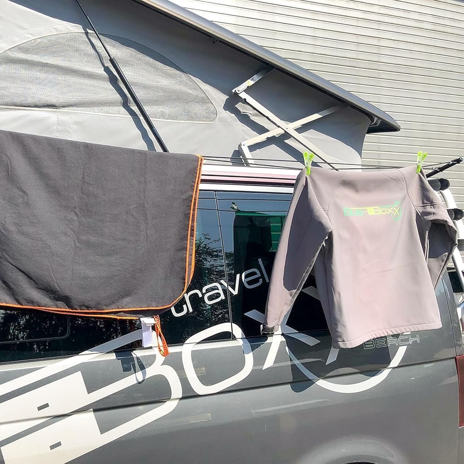 Sfârșit de rufe Bus-Boxx pentru șina de rufe - o soluție practică pentru viața de zi cu zi în camping. Sfârșitul de rufe Bus-Boxx este completarea ideală pentru excursia dvs. de camping. Potrivit pentru șinele de rufe ale Volkswagen-ului dvs. T5, T6 sau T6.1, vă permite să vă agățați rufele cu ușurință și siguranță. Cu o lungime de 5 metri, este perfect pentru camping, activități în aer liber și viața în autoutilitară. Avantajele dvs. dintr-o privire: Potrivit pentru șinele de rufe: conceput pentru șinele C ale VW-ului dvs. T5, T6 și T6.1 - ușor de instalat. PUTERNIC ȘI DURABIL: Fabricat din material durabil care poate rezista la condiții meteorologice nefavorabile. Lungime de 5 metri: Oferă spațiu amplu pentru a agăța haine, prosoape sau ustensile de camping. Compact și ușor: Se depozitează pentru a economisi spațiu - ideal pentru călătorii și activități în aer liber. Detalii tehnice: Lungime: 5 metri. Material: nailon durabil. Conținutul cutiei: 1 x sfârșit de rufe. Perfect pentru rulota dvs. Sfârșitul de rufe este special conceput pentru camping, activități în aer liber și viața în autoutilitară. Fie că este vorba de haine, prosoape sau echipament, sfârșitul de rufe Bus-Boxx vă oferă o soluție stabilă și fiabilă pentru călătorii. Datorită construcției sale robuste și manevrabilității ușoare, este esențială pentru orice rulotă.