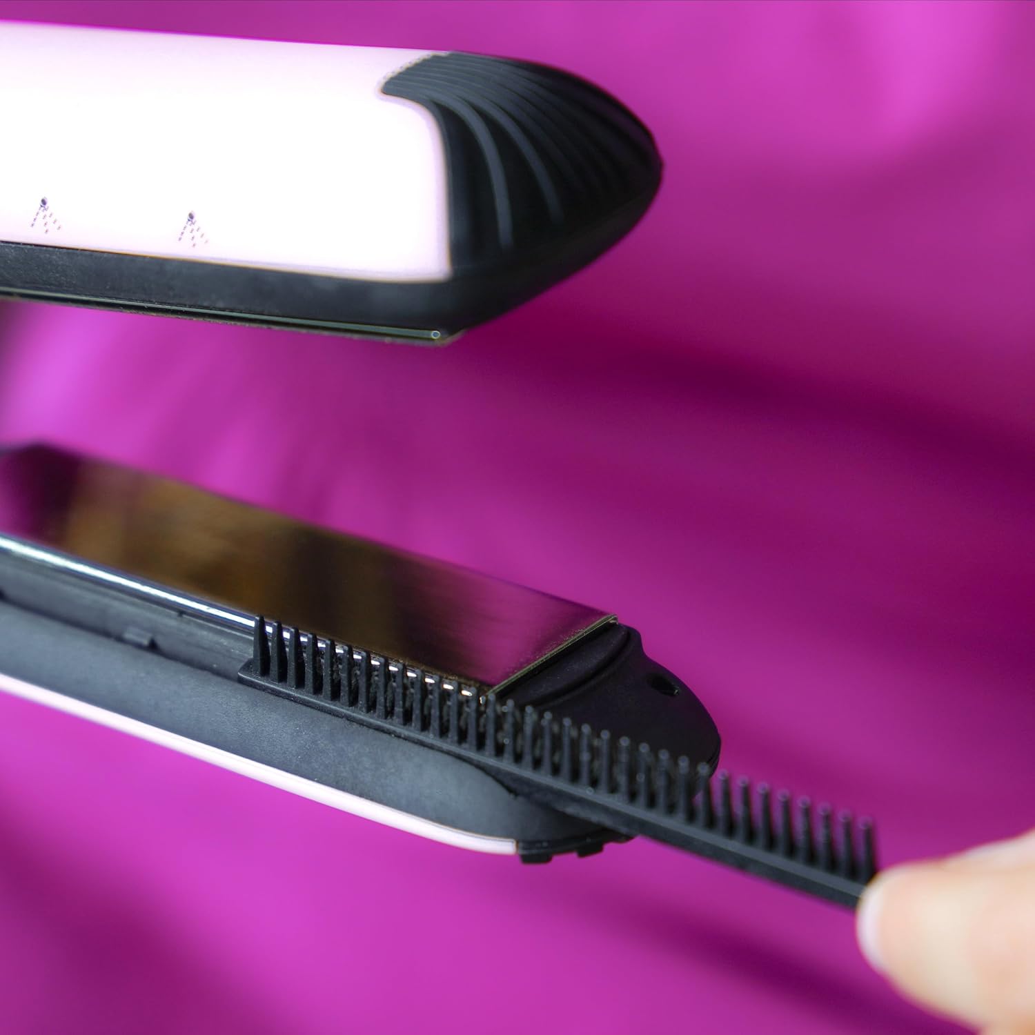 Instrucțiuni de utilizare: Separați părul șuviță cu șuviță și aplicați o tensiune la vârf pentru a-l îndrepta bine. Repetați procesul pe tot părul. Asigurați-vă că pictogramele de abur sunt orientate în jos, pentru o îndreptare optimă. În pachet este inclusă placa de îndreptat cu aburi cu cablu rotativ, pieptene lateral detașabil, pipetă de umplere și husă rezistentă la căldură, ideală pentru depozitare și călătorii!