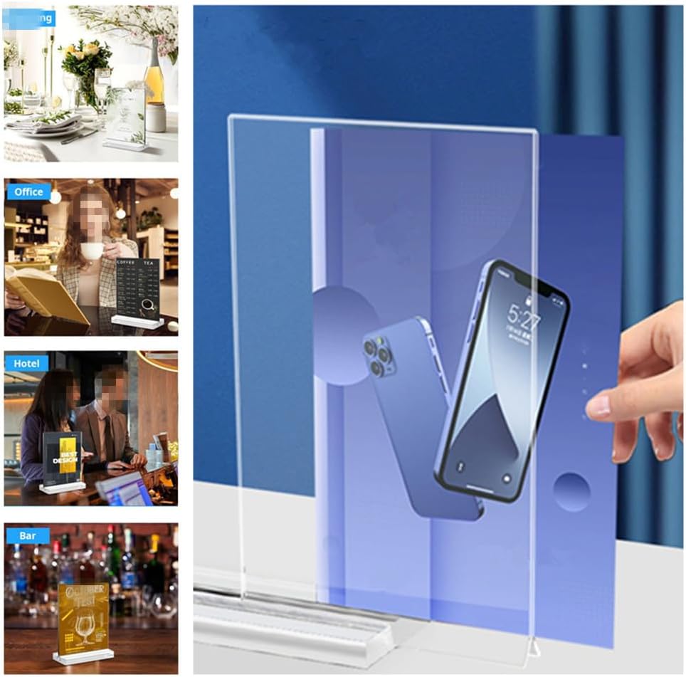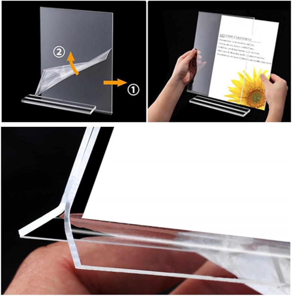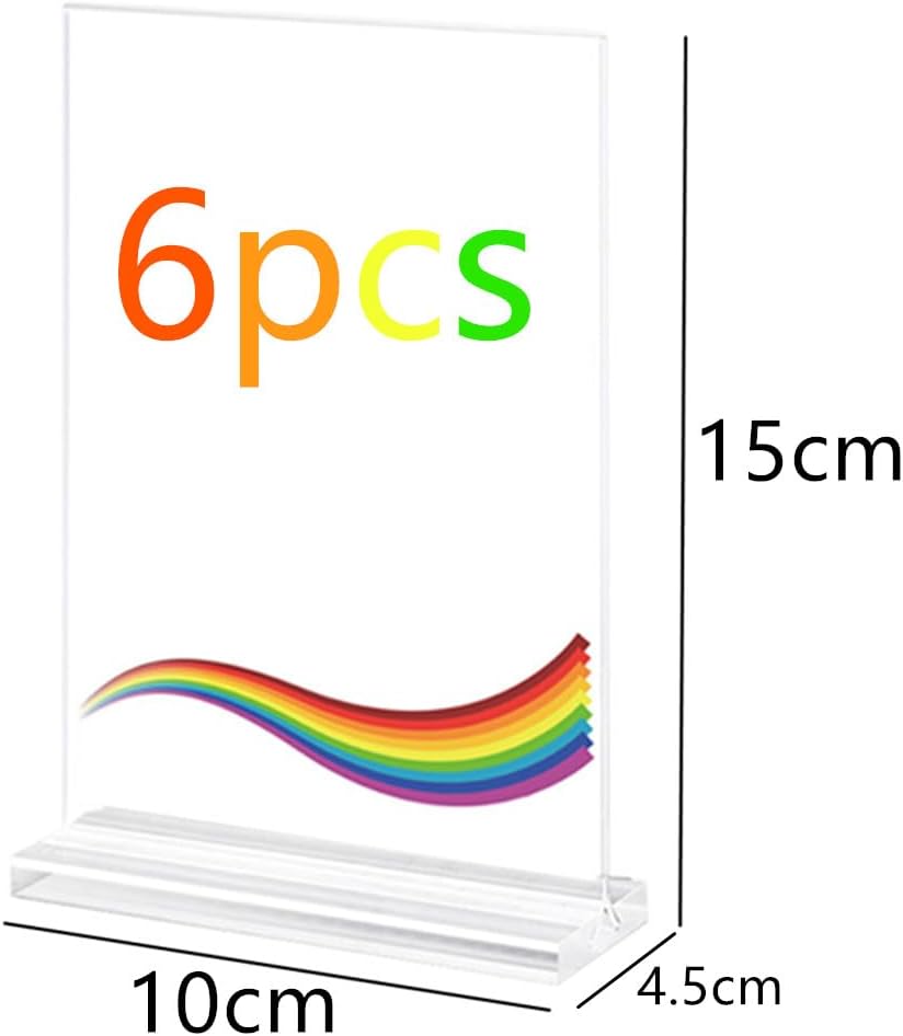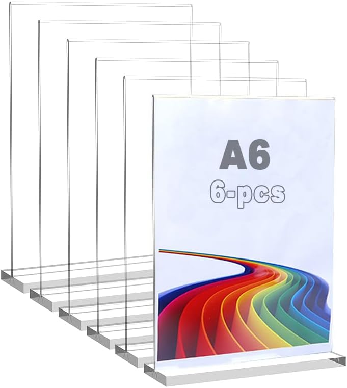 Standuri de afișare acrilice, Display-uri de masă A6, Standuri de afișare acrilice, Display-uri publicitare, Etichete de preț, Transparente pentru publicitate, Meniuri, Broșuri. Caracteristici: Transparență de înaltă rezoluție. Display-urile acrilice transparente afișează fiecare document la rezoluție înaltă, spre satisfacția clientului. Folie de protecție: Suprafața este acoperită cu o folie de protecție, pe care trebuie îndepărtată înainte de utilizare. Bază groasă pentru utilizare îndelungată: Structura stabilă și autoportantă este foarte practică. Specificații: 6 bucăți de display-uri de masă A6. Dimensiune A6: 15 x 10 cm. Material acrilic: Transparent, stabil și durabil.