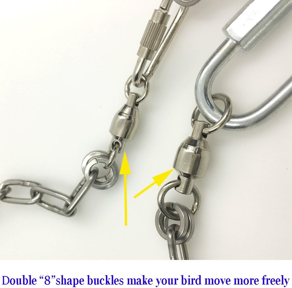 1. lanțul este cu cataramă rotativă, care permite păsărilor să se miște liber. NR.12.NR.15 este prevăzut cu două inele fixe pentru a-l face mai puternic, chiar și pentru papagalii Amazon/Ara nu este o problemă. 2. Vă sugerăm să purtați inelul de picior fără a conecta mai întâi lanțul, deoarece unele păsări sunt speriate și nu se pot obișnui cu lanțul pentru păsări la început; după ce pasărea dumneavoastră s-a obișnuit cu inelul de picior, atunci puteți încerca să atașați lanțul la el, important este doar pas cu pas, nu prea repede. 3. Verificați dacă lungimea lanțului este suficient de lungă pentru pasărea dumneavoastră. Lungime totală: Modelul 7 are o lungime de aproximativ 60 cm, iar modelele 12 până la 15 au o lungime de aproximativ 42 mm, inclusiv lungimea accesoriilor de pe ambele părți. 4. NR. 12 inelul pentru picior de pasăre are un diametru interior de aproximativ 11,5 mm, lungimea totală este de 42 cm. 5. NR. 15 inelul pentru picior de pasăre are un diametru interior de aproximativ 14,5 mm, lungimea totală este de 42 cm.