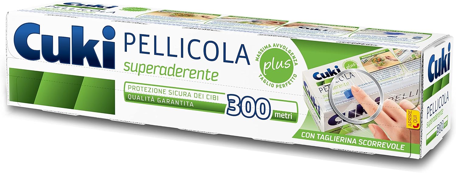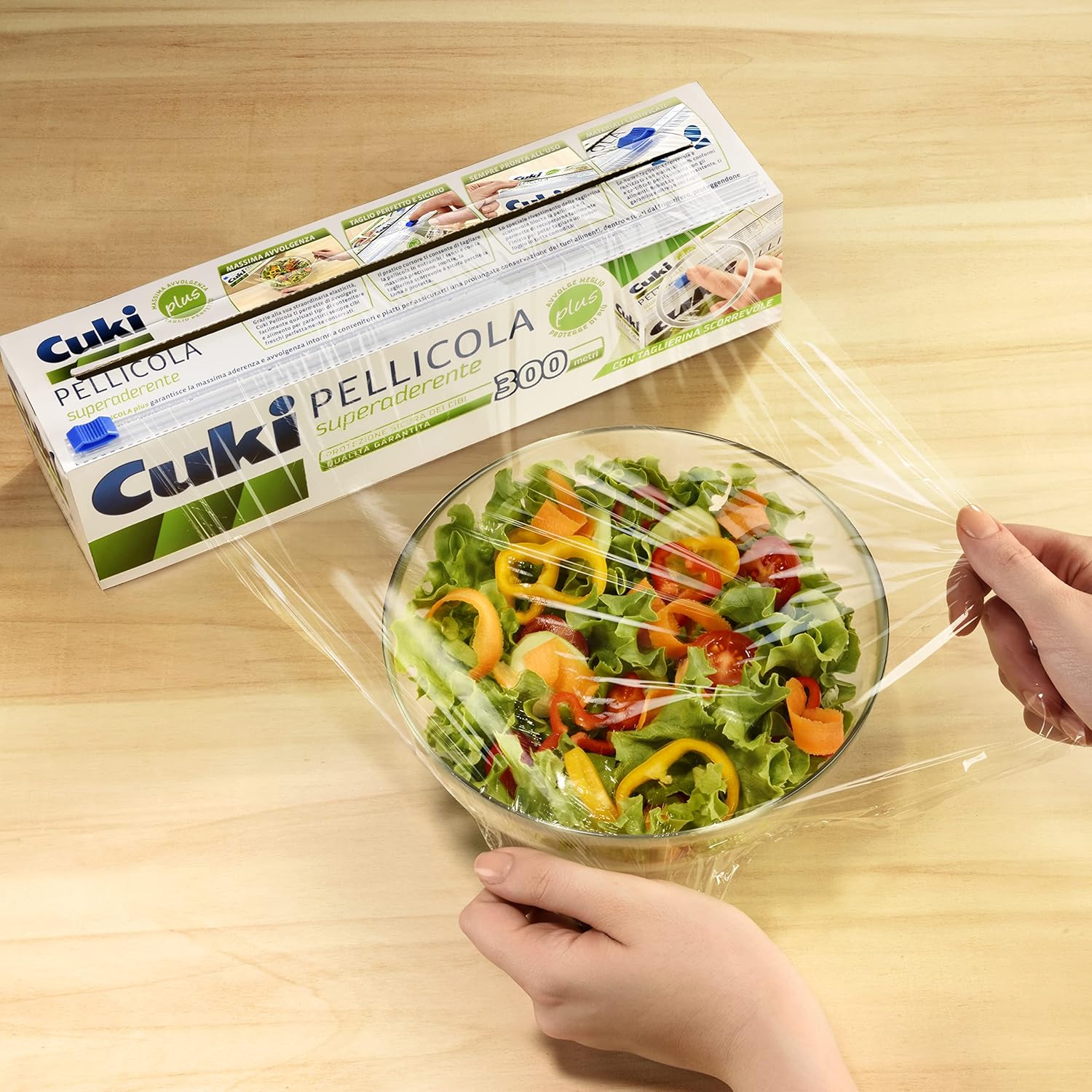 Folie Alimentară Cuki Super Aderentă, 300 Metri, cu Dispenser cu Lamă, 1 Bucată - Ideală pentru Păstrarea Prosperimii Alimentelor și Depozitare Ușoară.