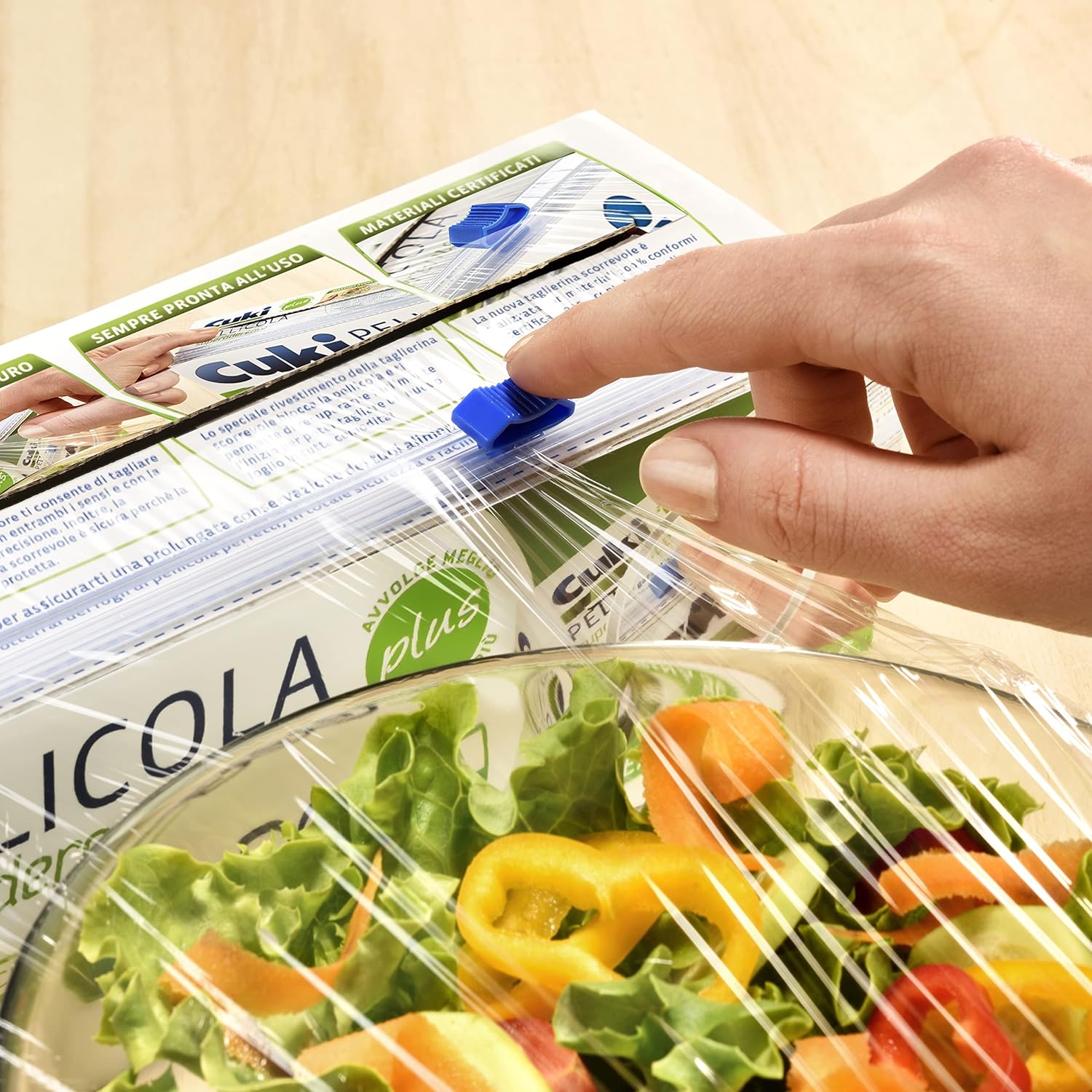 Despre acest articol: Super aderentă, elastică, auto-etanșantă, învelește orice aliment sau recipient. Protectoare și impermeabilă, păstrează prospețimea și umiditatea alimentelor, chiar și în afara frigiderului. Pachetul dispune de un tăietor inovator cu glisare, fabricat din materiale 100% certificate pentru contactul cu alimentele. Folia Cuki Plus, dacă nu prezintă reziduuri alimentare, poate fi reciclată la plastic; dacă este murdară, se aruncă la gunoi. Cutterul se reciclează. Tăietorul practic și funcțional este robust și super rezistent, permite o tăiere precisă și sigură a foliei și asigură peste 10.000 de tăieturi. Mai multe detalii despre produs