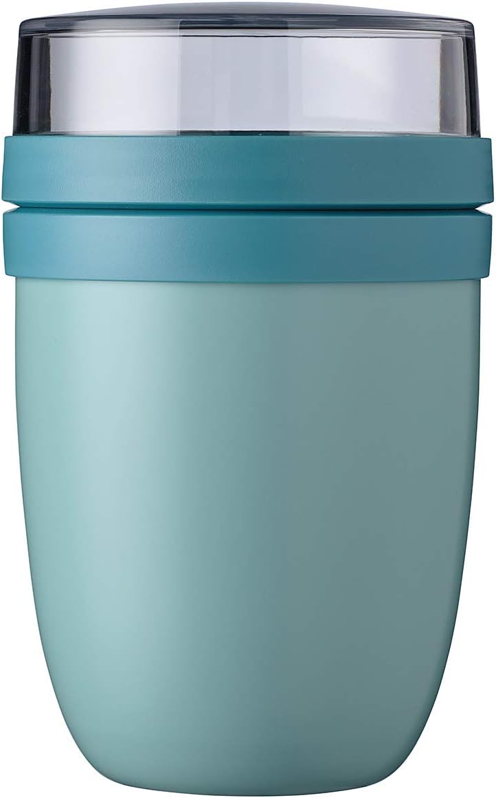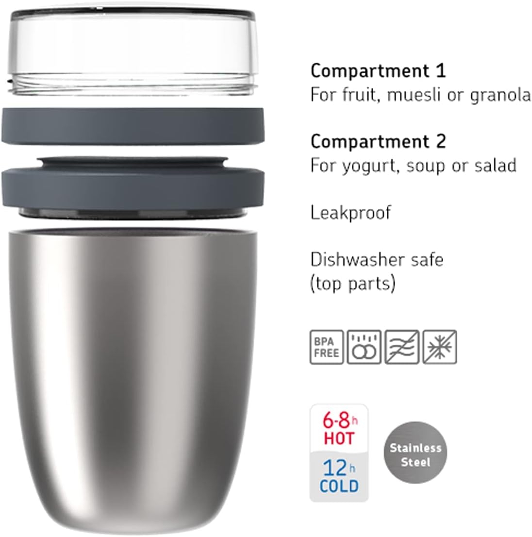 Despre acest produs Borcanul de prânz termo Ellipse de la Mepal din titan este recipientul ideal pentru a lua prânzuri calde sau reci, gustări și prânzuri la pachet. Borcanul de prânz termo este rezistent la scurgeri și este format din două recipiente diferite în care pot fi luate separat două ingrediente ale unei mese. Recipientul termoizolant cu pereți dubli păstrează mâncarea caldă timp de până la 6 ore sau rece timp de 12 ore. Învelișul exterior al Thermo Lunchpot rămâne întotdeauna uscat și rece, indiferent de temperatura din interior 6 recipiente: capacitate de 500 ml și 200 ml, pentru supă și crutoane sau iaurt și muesli. Alte detalii despre produs