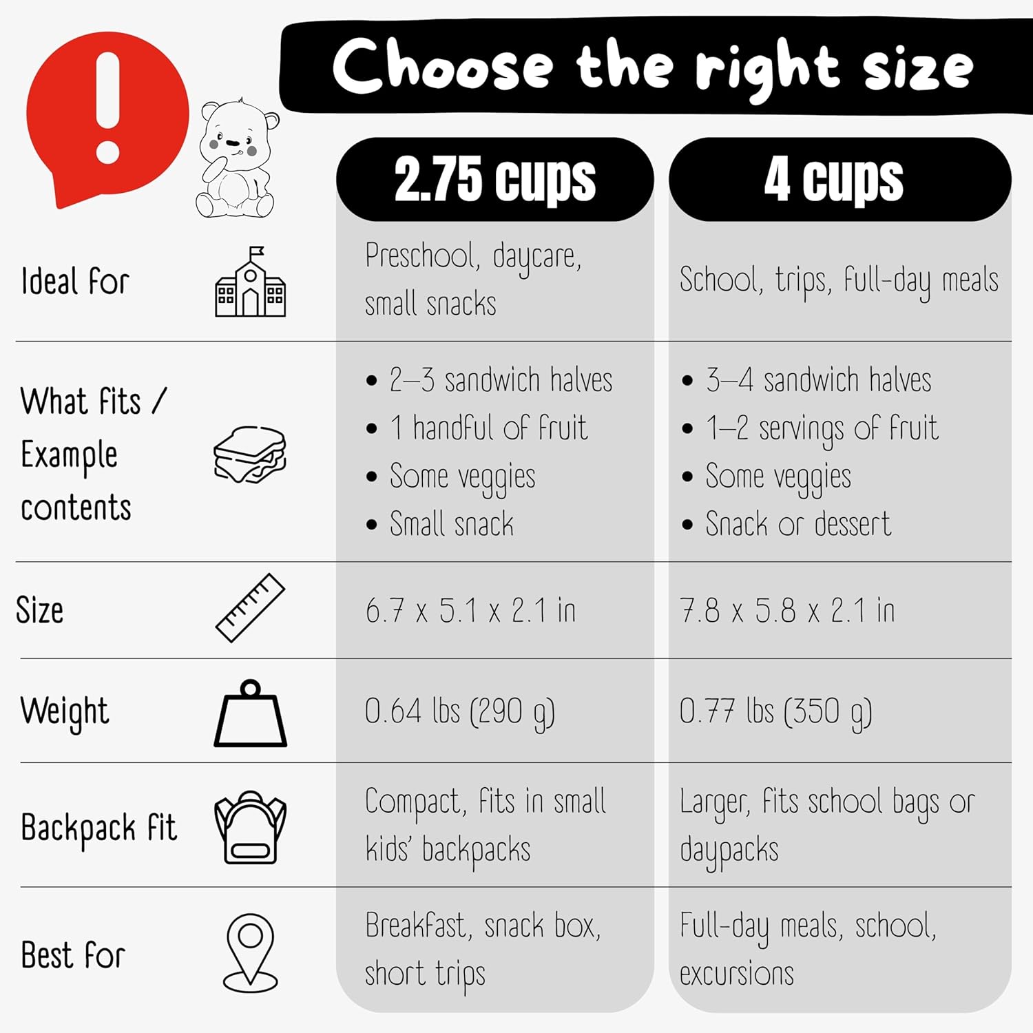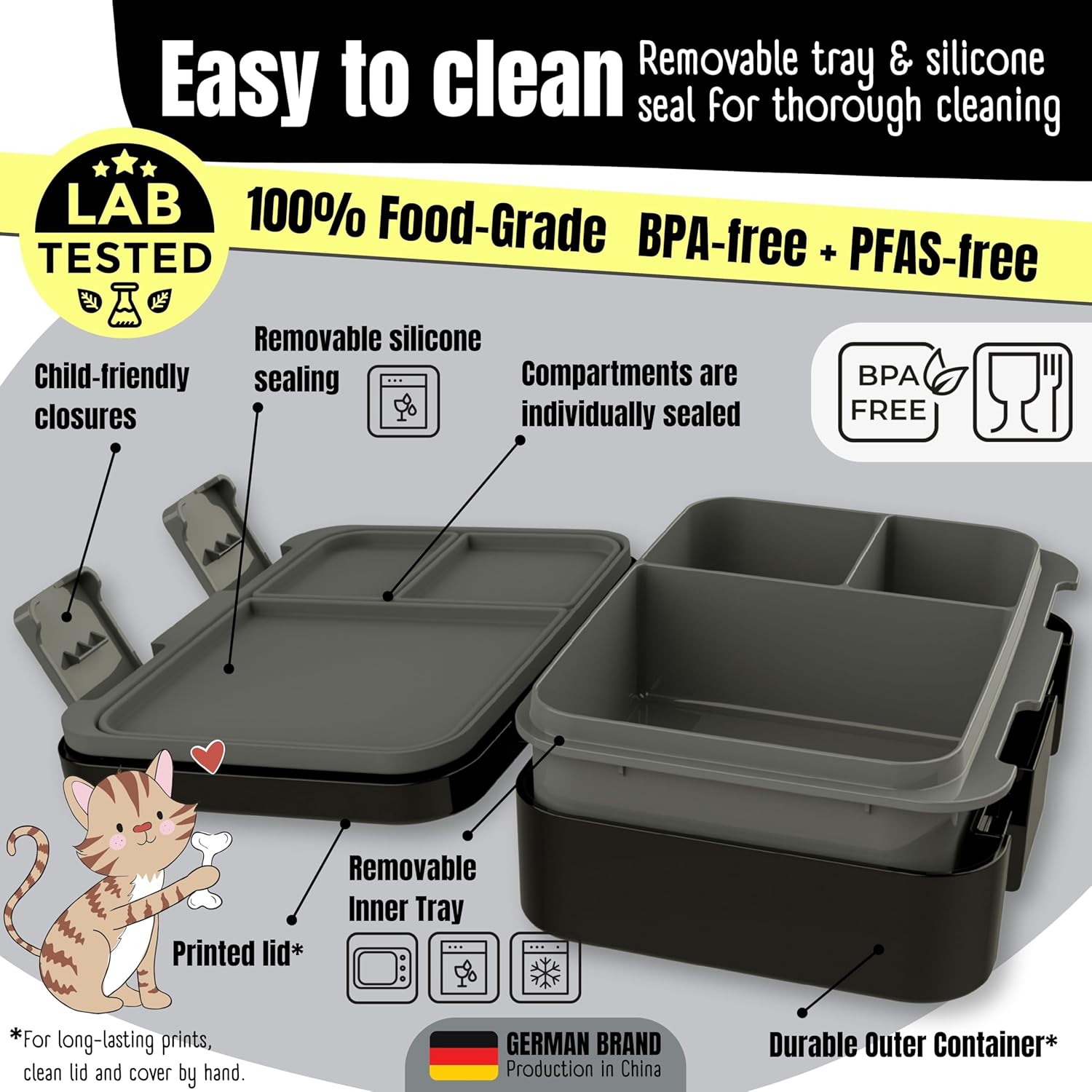 • 🎨 Marcă germană – Design unic, desenat manual: Ilustrațiile adorabile, desenate manual, de la o marcă germană de încredere, fac această cutie cu gustări pentru copii distractivă și incitantă. Perfectă pentru băieți și fete cu vârsta de 3 ani și peste, care urmează cursurile grădiniței, creșei sau școlii primare. • 🪶 Ușoară, compactă și durabilă: Cu o greutate de doar 0,64 lbs, această cutie bento pentru copii este cu aproape 50% mai ușoară decât altele, dar are o capacitate de 2,75 căni (650 ml / 22 oz). Carcasa exterioară durabilă este rezistentă la căderi și se potrivește cu ușurință în rucsacuri mici – ideală pentru călătorii, picnicuri și gustări școlare. • 💧 Cutie de prânz 100% etanșă pentru copii, cu compartimente separate: Proiectată cu 3 compartimente sigilate individual și o garnitură detașabilă din silicon, menținând alimentele proaspete și prevenind scurgerile. Excelentă pentru sandvișuri, fructe, legume, gustări, sosuri și multe altele – fără mizerie în pungile de prânz! • 🌱 Sigur, de calitate alimentară și ecologic: Fabricat din materiale testate în laborator, fără BPA, fără PFAS și non-toxice. 100% sigur pentru alimente, reutilizabil și ecologic - o alternativă sustenabilă la pungile de plastic de unică folosință și recipientele de unică folosință. • 🧼 Ușor de curățat și sigur pentru cuptorul cu microunde: Tava interioară detașabilă este potrivită pentru mașina de spălat vase și cuptorul cu microunde, pentru o reîncălzire rapidă și o curățare fără efort. Închiderile prietenoase cu copiii sunt ușor de deschis și închis de către mânuțele mici - făcând masa fără stres pentru părinți și copii.