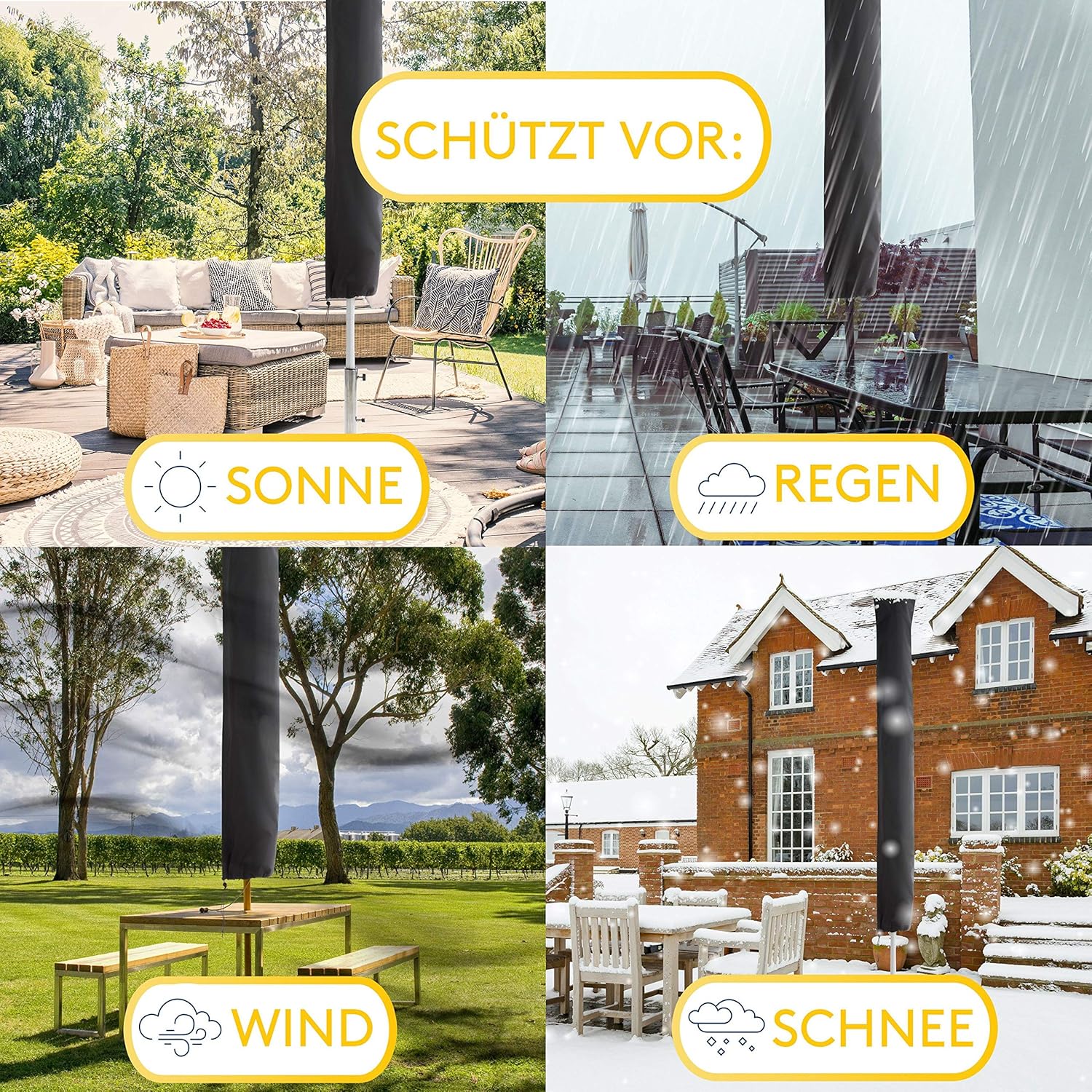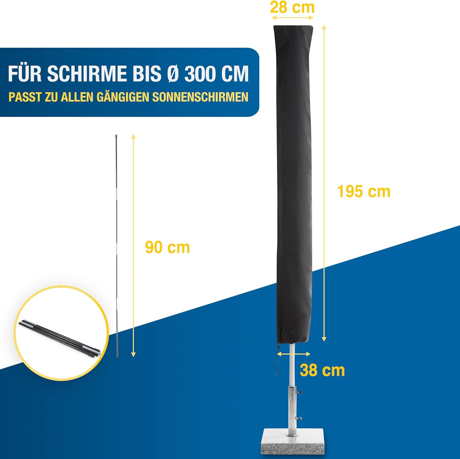 Informații despre acest articol INDIVIDUAL - Husa noastră pentru umbrelă de soare SPRINKS se adaptează la umbrela dvs. de soare. Datorită cordonului integrat, puteți utiliza husa de umbrelă de soare pentru practic toate umbrelele de soare de până la ≤ Ø 300 cm. ȚESUT - Protejați-vă umbrela de soare de intemperii cu husa pentru umbrelă de soare. Țesătura durabilă 600D Oxford cu înveliș din PVC poate rezista la orice vreme. BASTON DE AJUTOR - Livrarea include un baston de ajutor pentru tragerea ușoară a husei de protecție pentru umbrele de soare. Experimentați modul simplu și necomplicat de a vă acoperi parasolarul. Rezistent la rupere - Materialul de înaltă calitate utilizat pentru husa de protecție este rezistent la UV, foarte rezistent la rupere și durabil. Acest lucru înseamnă că umbrela dvs. de soare rămâne 100% protejată chiar și în condiții de zăpadă, ploaie și vânt. CALITATE - Suntem convinși de calitatea husei noastre de protecție pentru umbrele de soare. Dacă nu sunteți mulțumit, veți primi banii înapoi timp de până la doi ani de la cumpărare. Convingeți-vă acum! Alte detalii despre produs