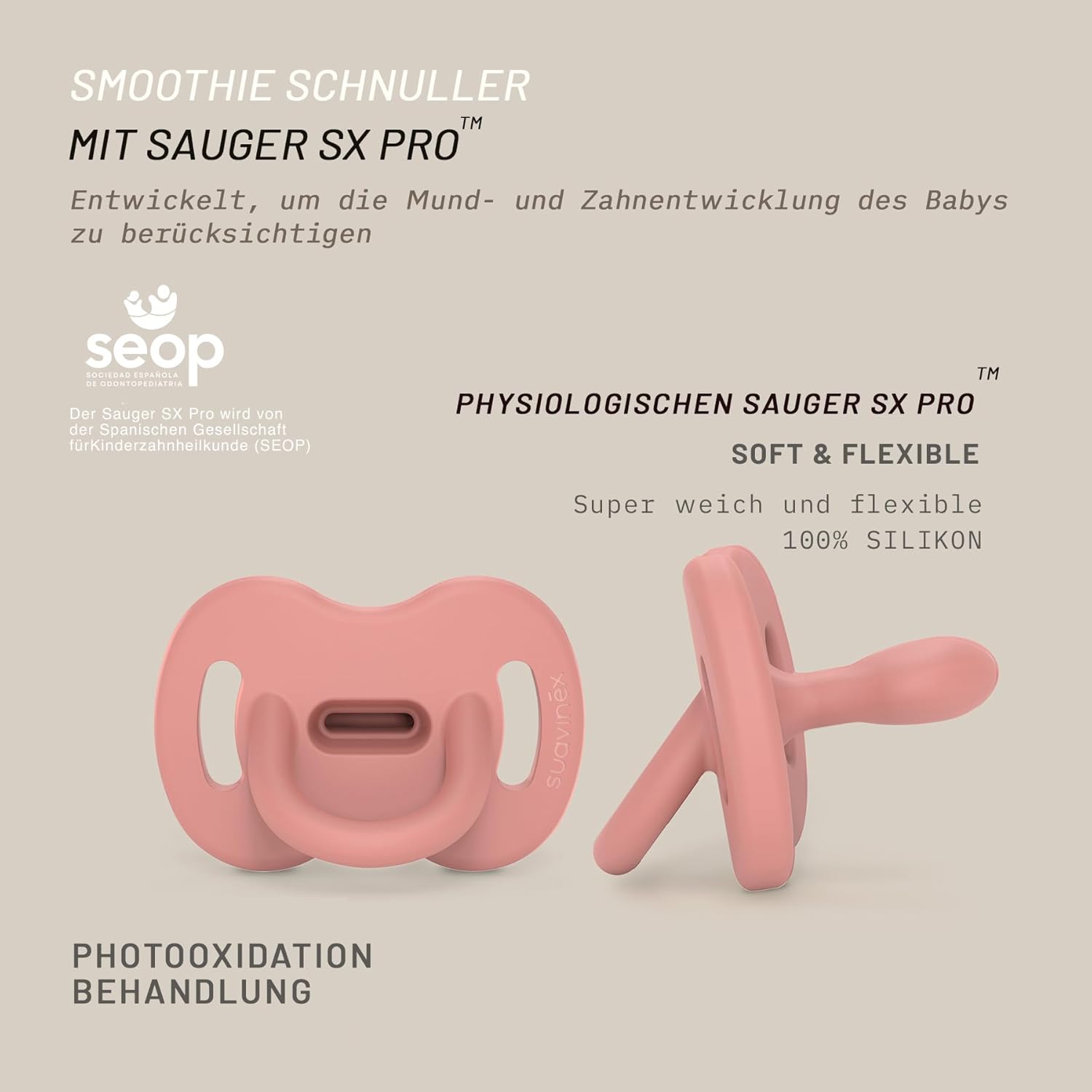 Informații despre acest articol SUZETĂ DIN SILICON. Suzetă Suavinex Smoothie cu tetină fiziologică - simetrică SX Pro, pentru nou-născuți și bebeluși de 0-6 luni RESPECTĂ dezvoltarea orală. Tetina SX Pro este concepută pentru a nu pătrunde în cavitatea bucală și pentru a oferi bebelușului aceeași senzație pe care o are în starea sa naturală/fiziologică, atunci când nu folosește suzeta. SIMETRICĂ. Tetina simetrică, plată și reversibilă permite o închidere aproape completă a gurii. 100% SILICON. Suzete 100% cu o tetină din silicon ultra-moale, fiziologic fină, care imită textura și consistența mamelonului matern. SUZETĂ PENTRU SOMN. Ideală pentru somn, nu marchează fața bebelușului. TRATAMENT DE FOTOXIDARE. Minimizează aderența scamelor și a particulelor de murdărie pe suzetă. Fără aditivi. Sigură. COLOUR ESSENCE. Această suzetă face parte din noua colecție Suavinex Colour Essence. Mai multe detalii despre produs