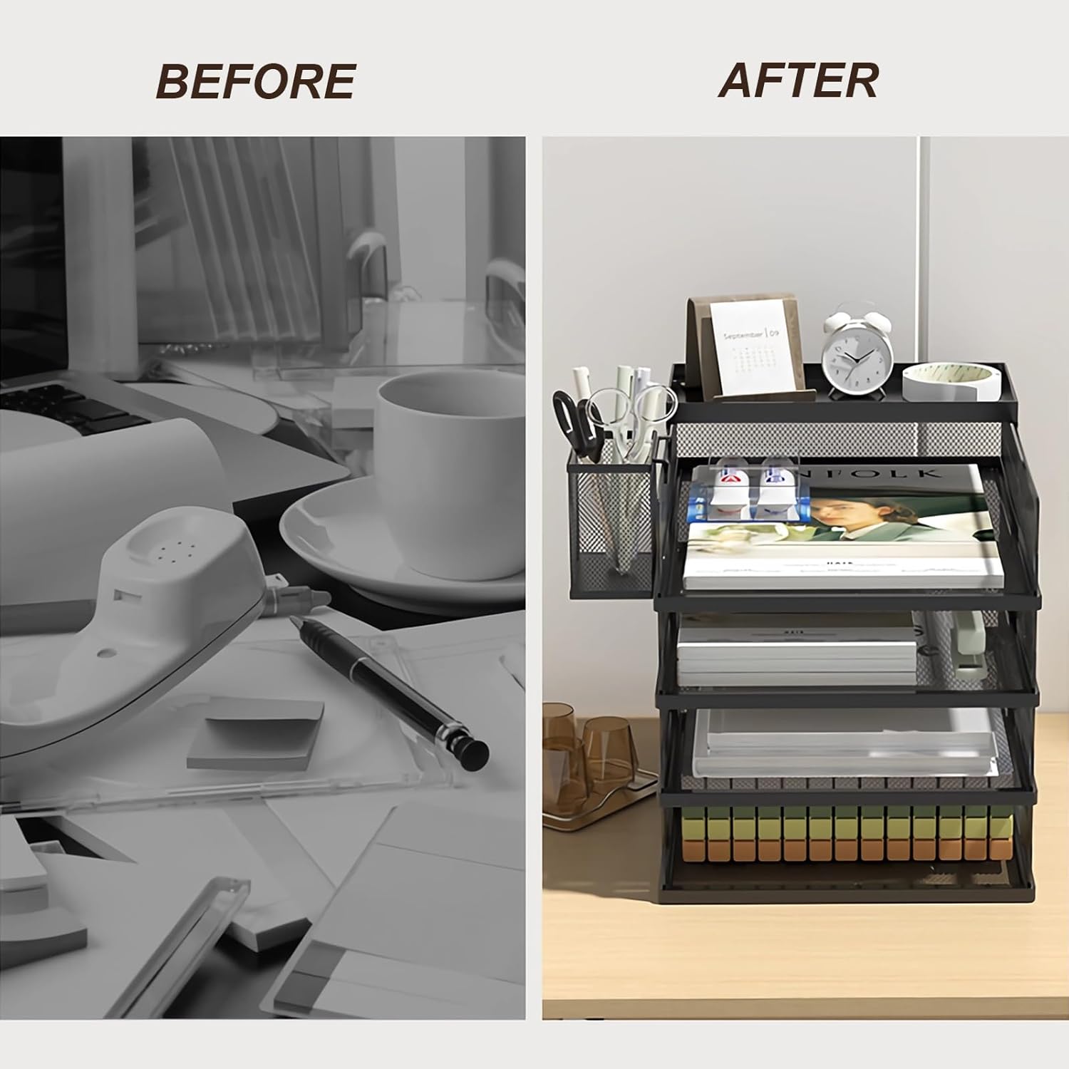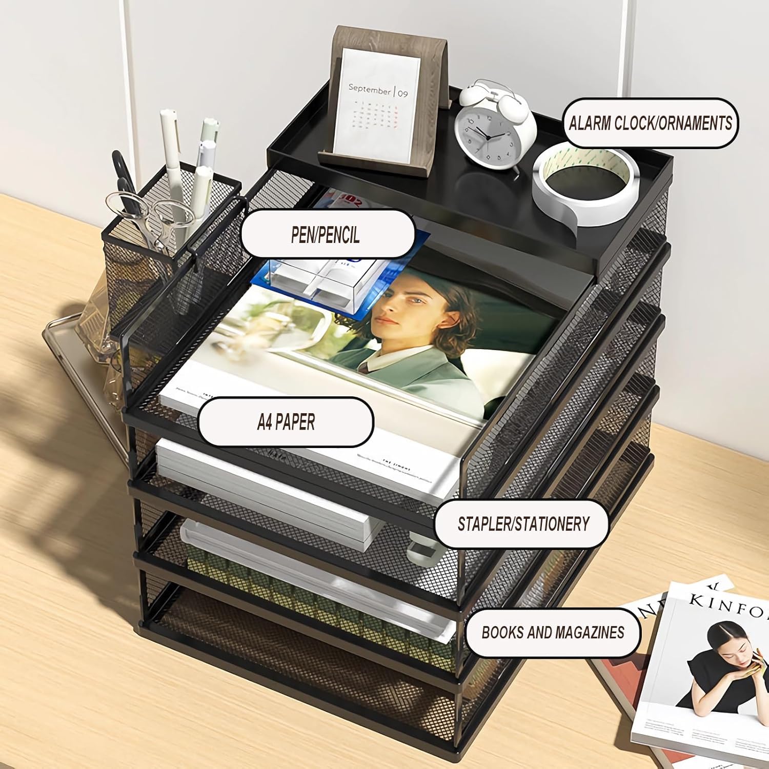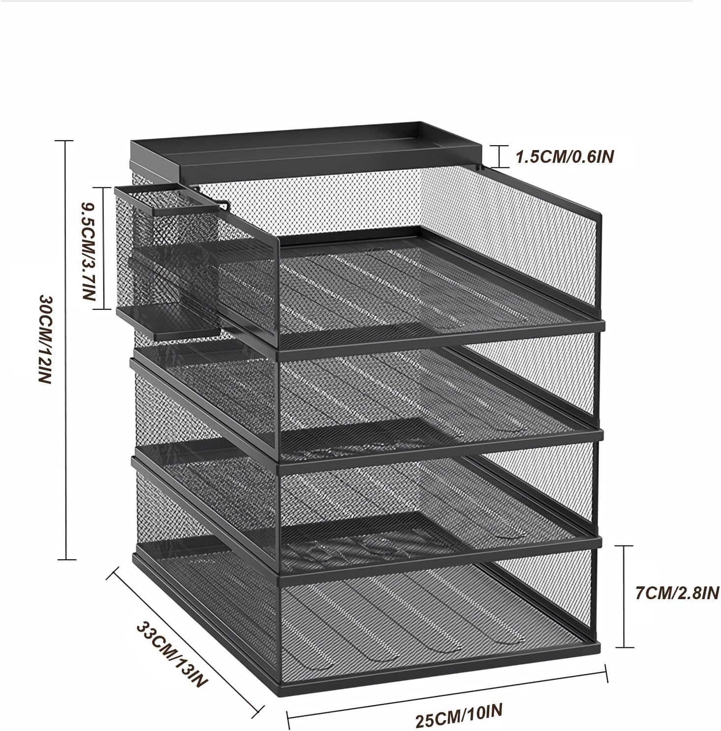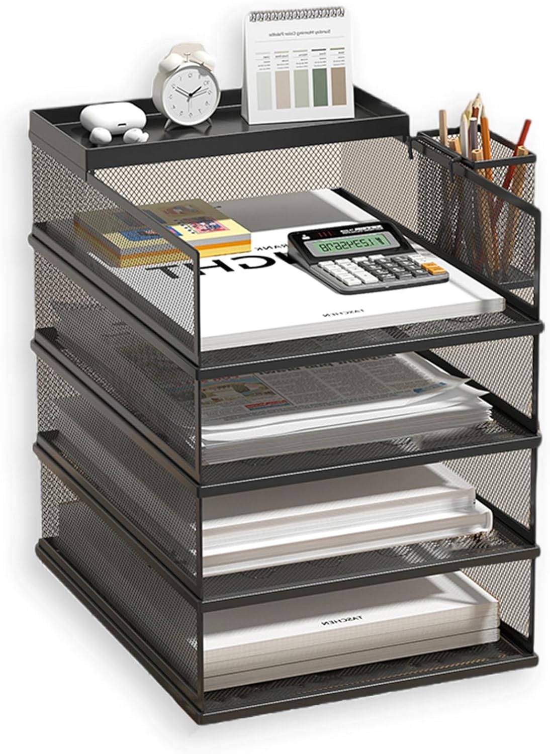 Organizează-ți biroul cu ajutorul setului de birou cu 5 niveluri, ideal pentru a păstra documentele, dosarele și accesoriile într-un mod ordonat și accesibil. Construcția robustă din plasă de oțel negru asigură durabilitate, iar designul modular permite personalizarea spațiului de lucru.