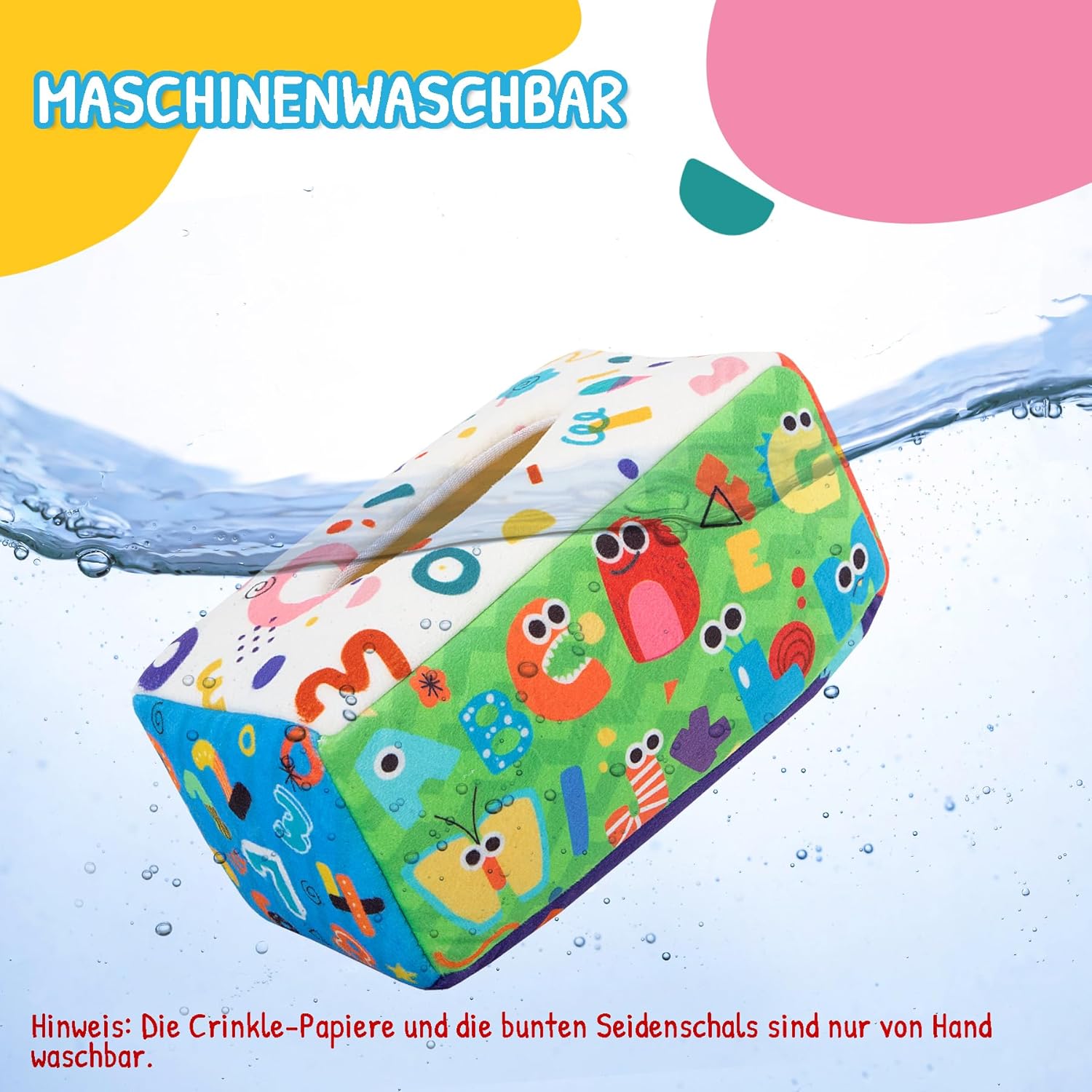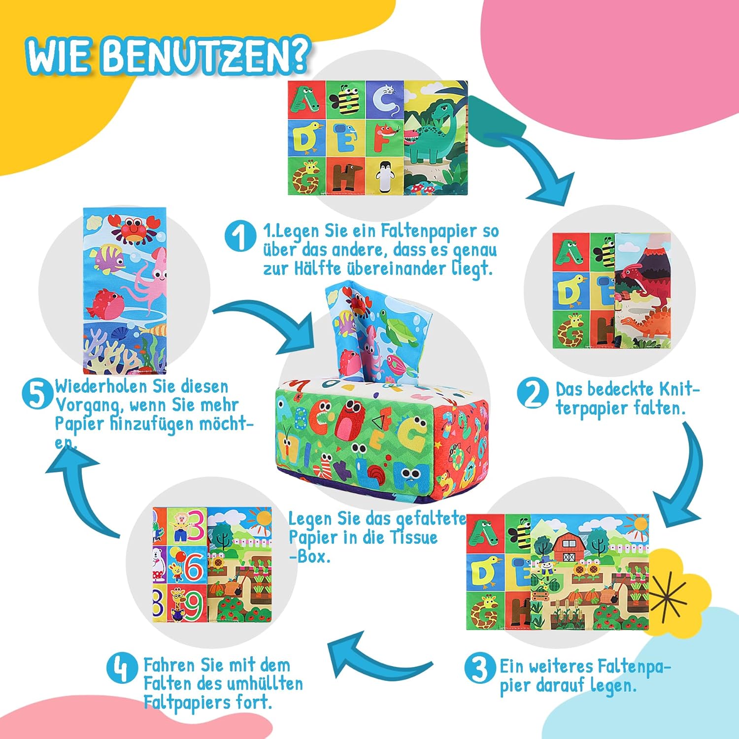 Informații despre acest articol Jucărie Montessori amuzantă: Bebelușii și copiii mici sunt curioși și dornici să învețe despre lumea din jurul lor. Scoaterea șervețelelor dintr-o cutie de șervețele poate fi o activitate captivantă și fascinantă pentru ei. Este, de asemenea, o modalitate bună de a promova coordonarea mână-ochi a bebelușului și motricitatea fină, precum și de a dezvolta capacitatea bebelușului de a se concentra pe un singur lucru în timp ce se joacă cu aceste jucării Montessori. Jucărie senzorială cu teme multiple: Hârtiile șifonate și exteriorul cutiei de șervețele sunt imprimate cu diverse motive. Cu culorile lor luminoase și sunetele foșnitoare, aceste jucării pentru bebeluși captivează atenția copilului dumneavoastră și încurajează jocul concentrat. Astfel, bebelușii nu numai că își pot antrena motricitatea fină, dar sunt și încurajați să-și țină capul sus în timp ce se joacă pe burtică, antrenând mușchii umerilor și gâtului. Promovează învățarea timpurie: Este o jucărie Montessori grozavă. Nu numai cutia magică de șervețele pentru bebeluși, ci și hârtiile șifonate sunt modelate cu litere și cifre. Stimulează memoria și imaginația bebelușului dumneavoastră și îl ajută să învețe diverse cuvinte, imagini și vocabular în timp ce se joacă cu această jucărie. Material sigur și ușor de curățat: Bebelușilor le place să pună în gură tot ce găsesc. De aceea, acordăm o mare importanță siguranței jucăriilor. Jucăriile pentru bebeluși sunt fabricate din materiale non-toxice, ușor de curățat, astfel încât să le puteți lua oriunde, iar culorile și modelele nu se decolorează ușor. Notă: Cutia de șervețele este lavabilă la mașină, dar hârtia de împăturit și șervețelele colorate sunt lavabile numai manual. Cadou perfect pentru bebeluși și fetițe: Credem că vă veți bucura de un timp fericit jucându-vă cu copiii dumneavoastră cu aceste jucării. Indiferent de vârstă și sex, cutia noastră de șervețele este o jucărie de dezvoltare ideală pentru nou-născuți cu vârste cuprinse între 0 și 12 luni, un cadou perfect pentru zile de naștere și Crăciun.
